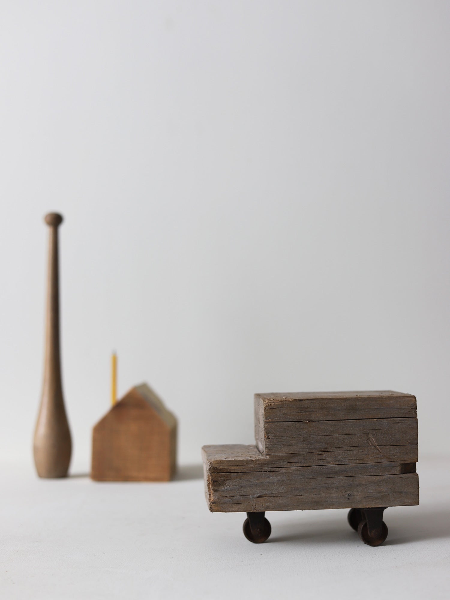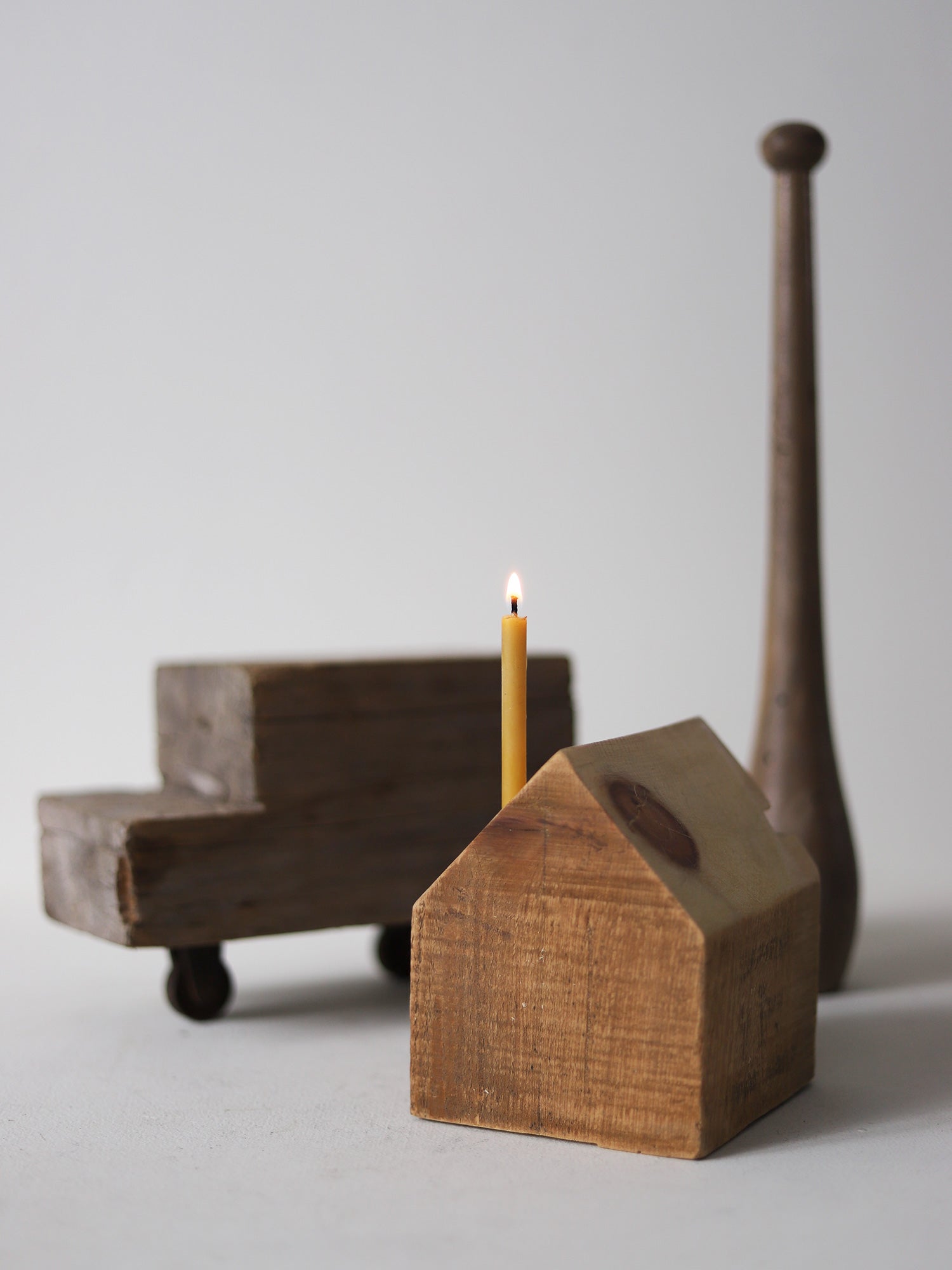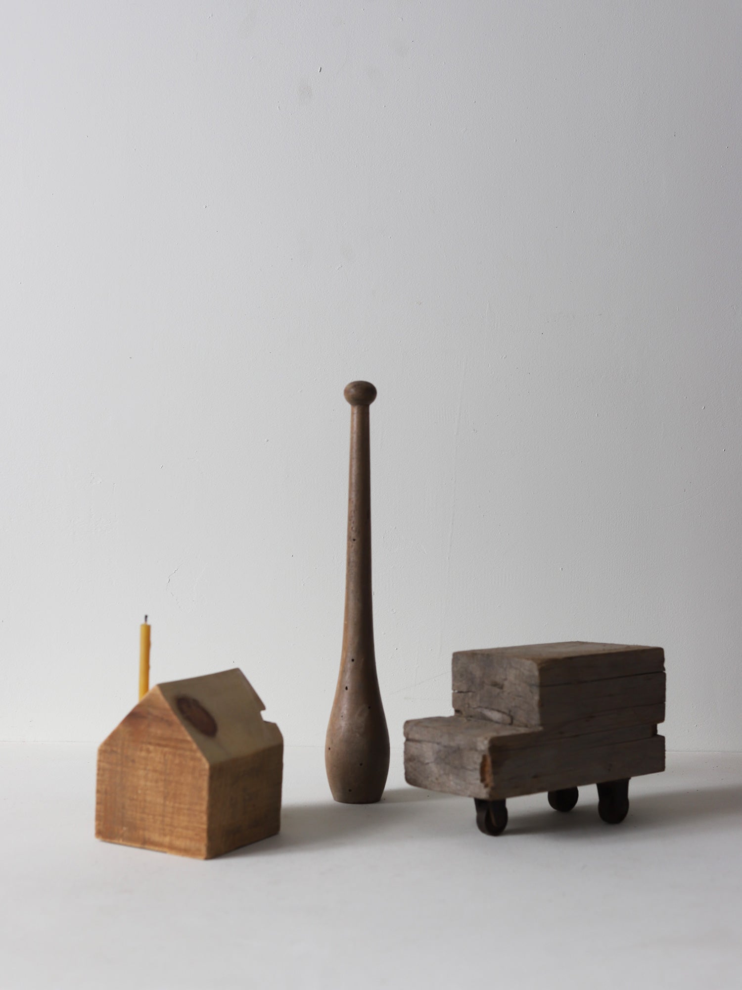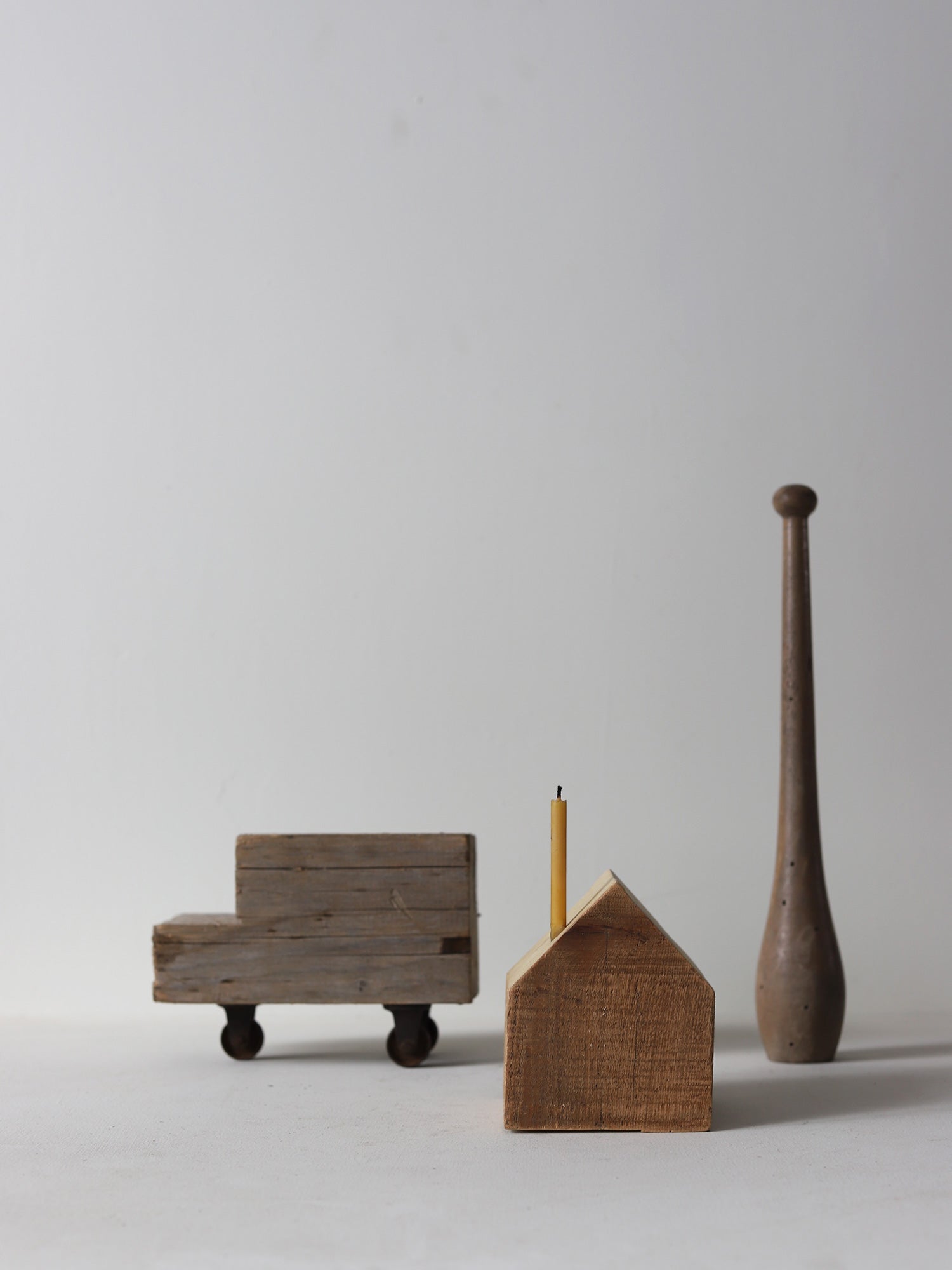 古い角材のオート三輪、実は車輪がとても渋いのです。三角屋根のキャンドルスタンドはヒバの木でとても良い匂いがします。ジャグリングはまずは一本からはじめましょう。どれも楽しいです。