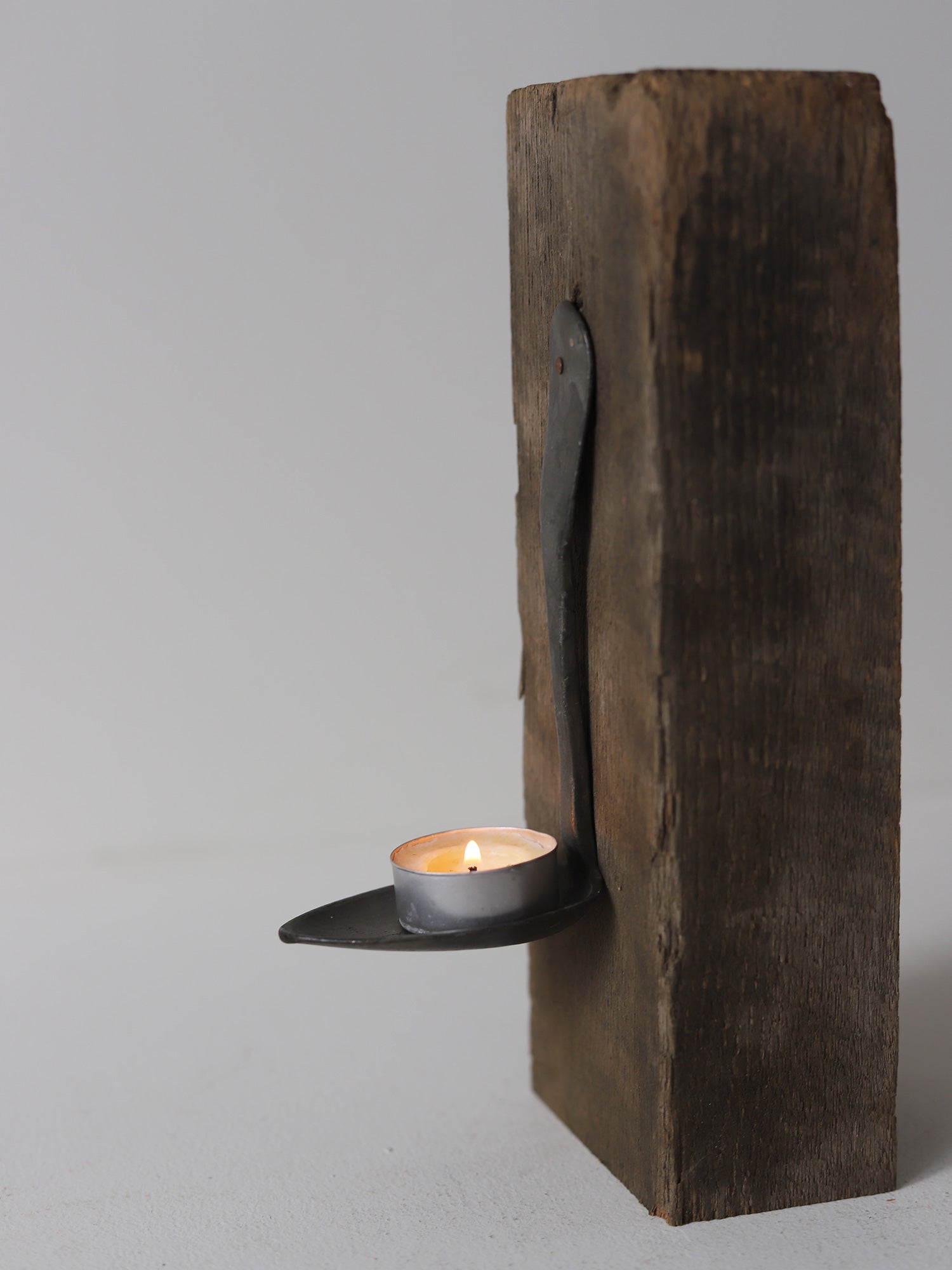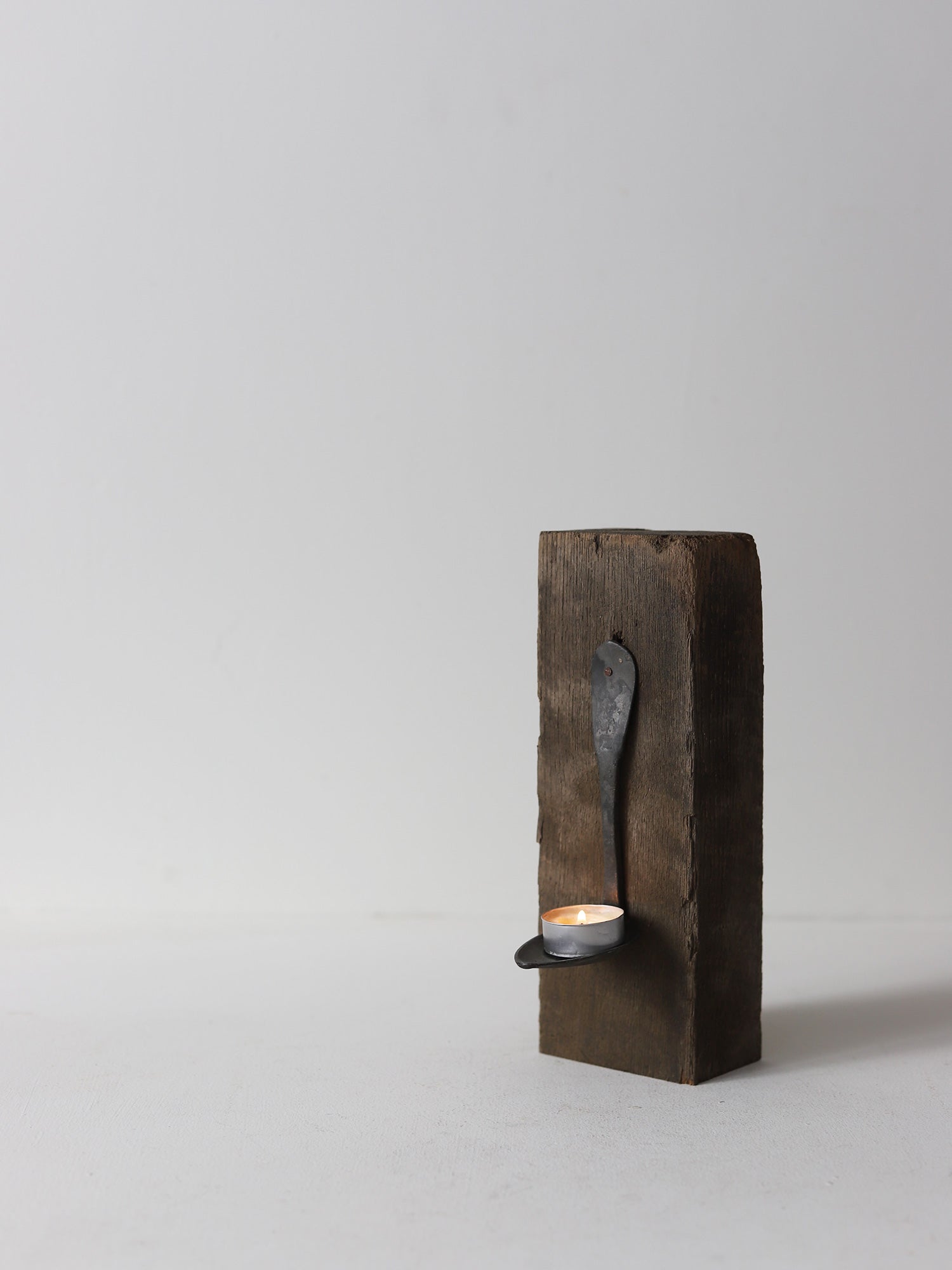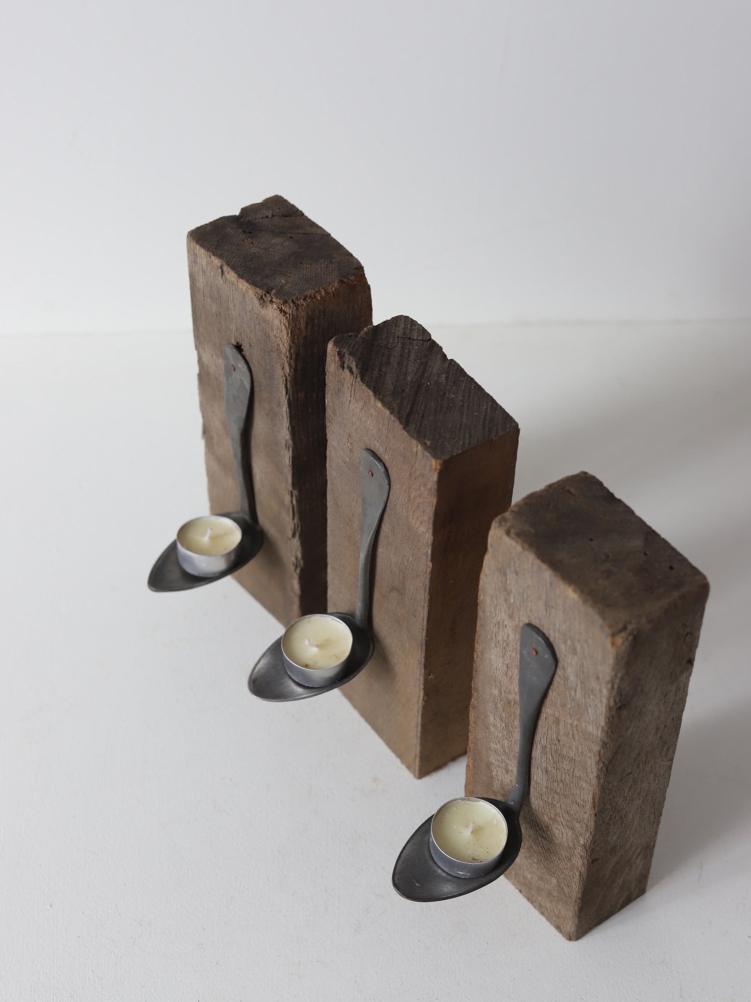 家づくりの作業中にでた楢の古材の端っこ。とてもずっしりしてます。これにベルギーの古いピューターのスプーンを合わせてキャンドルスタンドにしました。サンプルのキャンドルもおつけします。