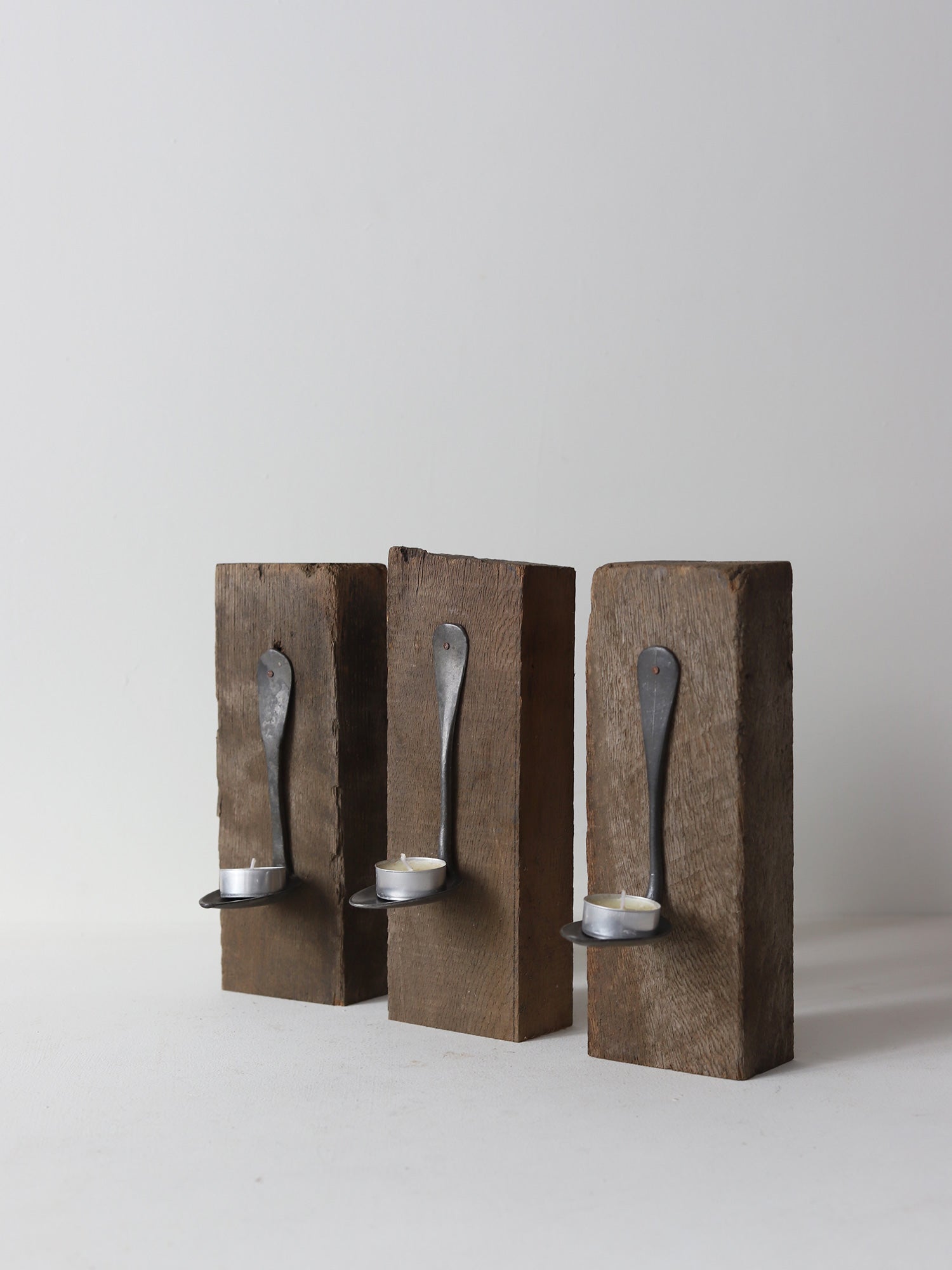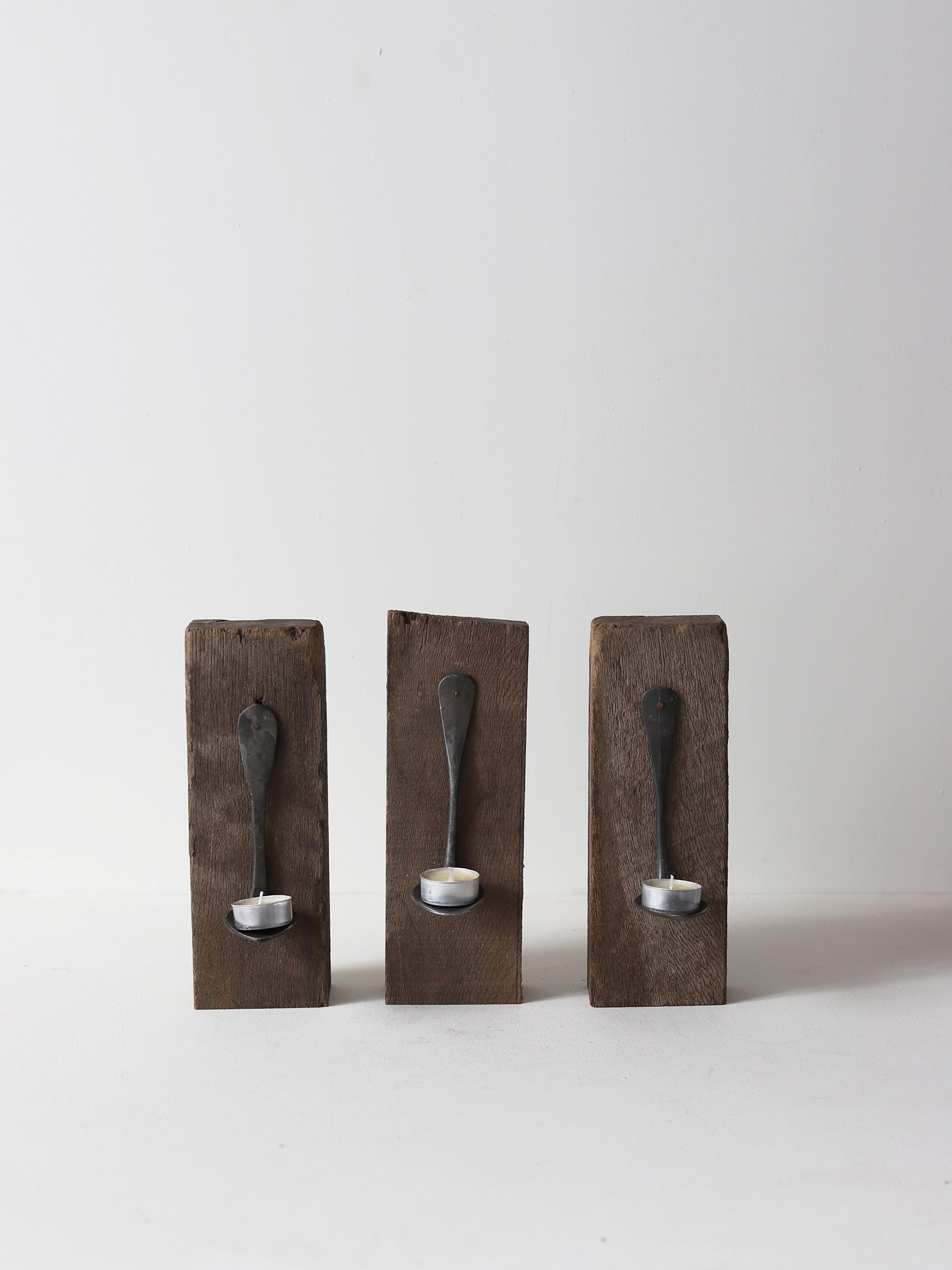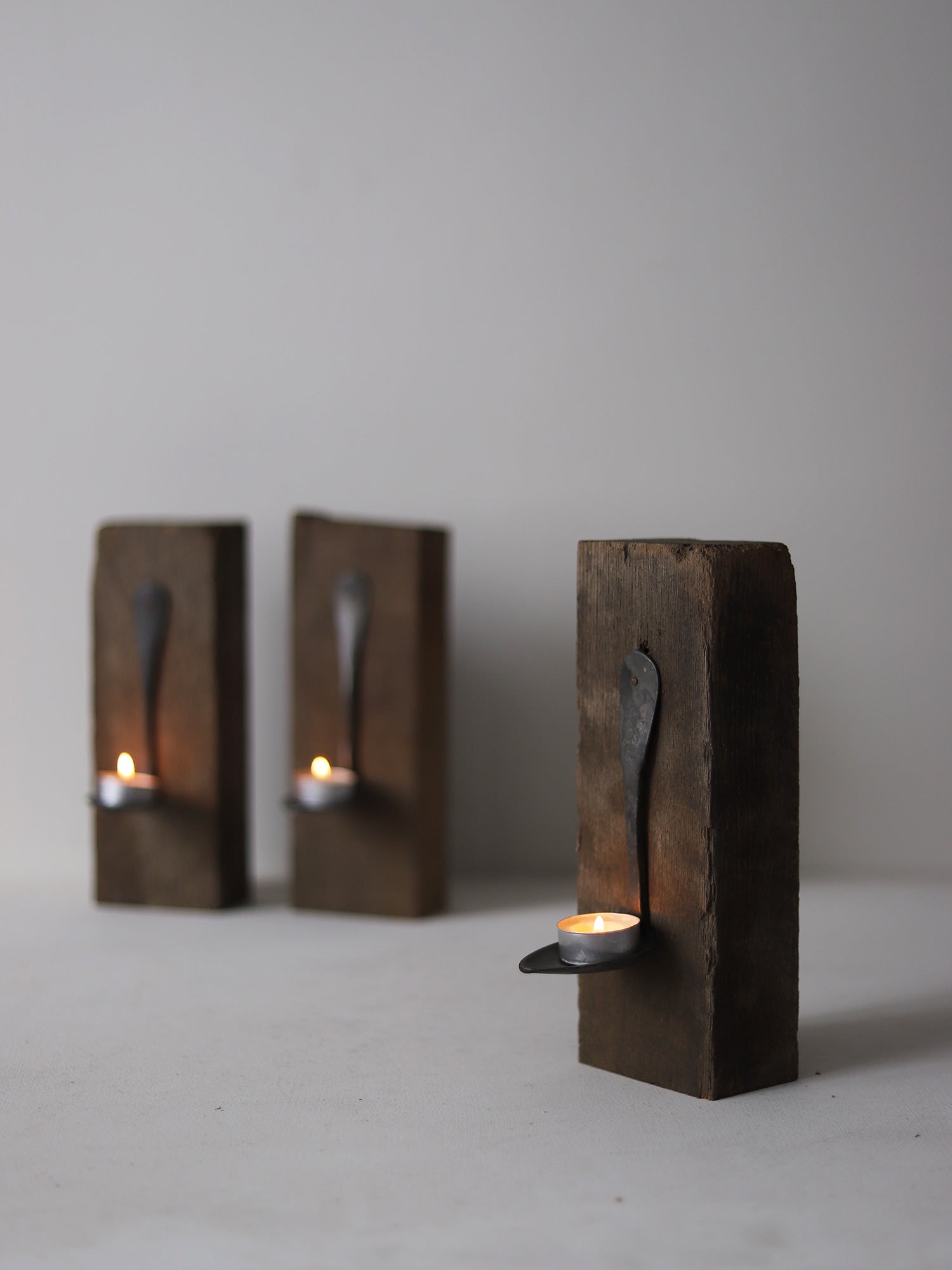 家づくりの作業中にでた楢の古材の端っこ。とてもずっしりしてます。これにベルギーの古いピューターのスプーンを合わせてキャンドルスタンドにしました。サンプルのキャンドルもおつけします。