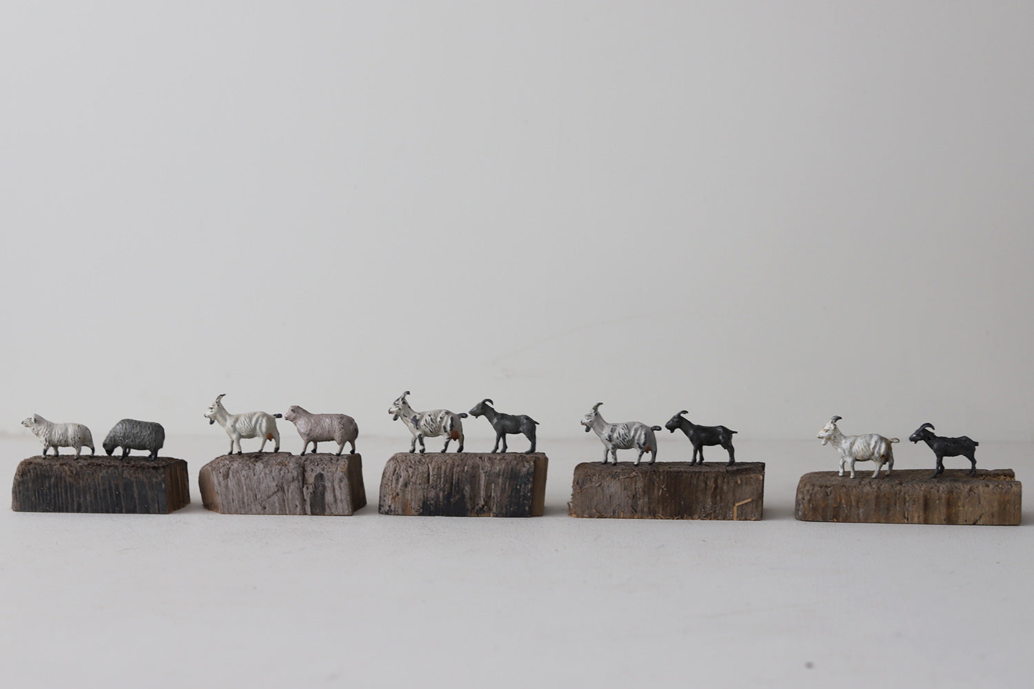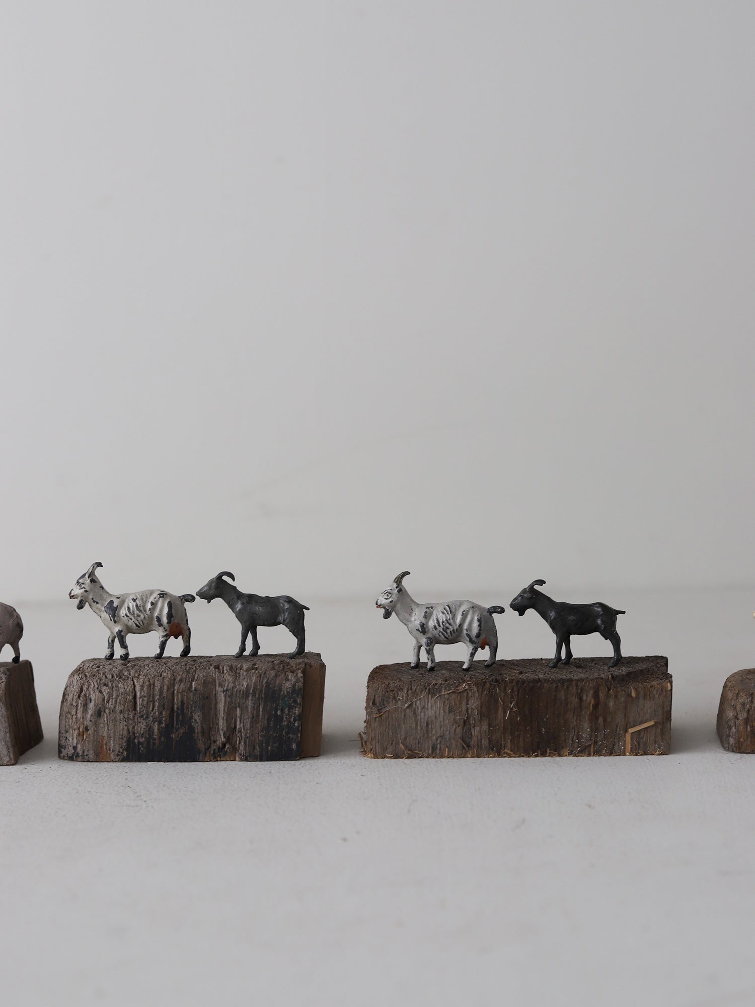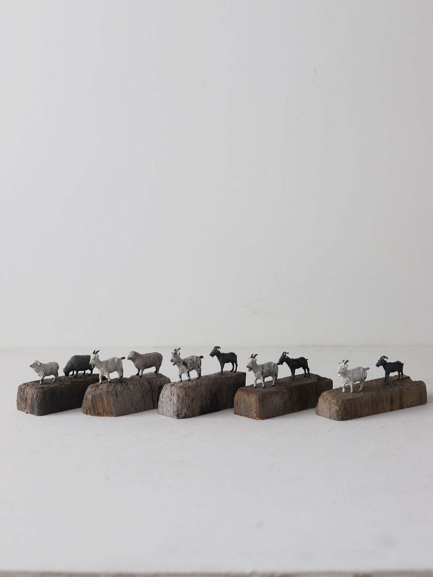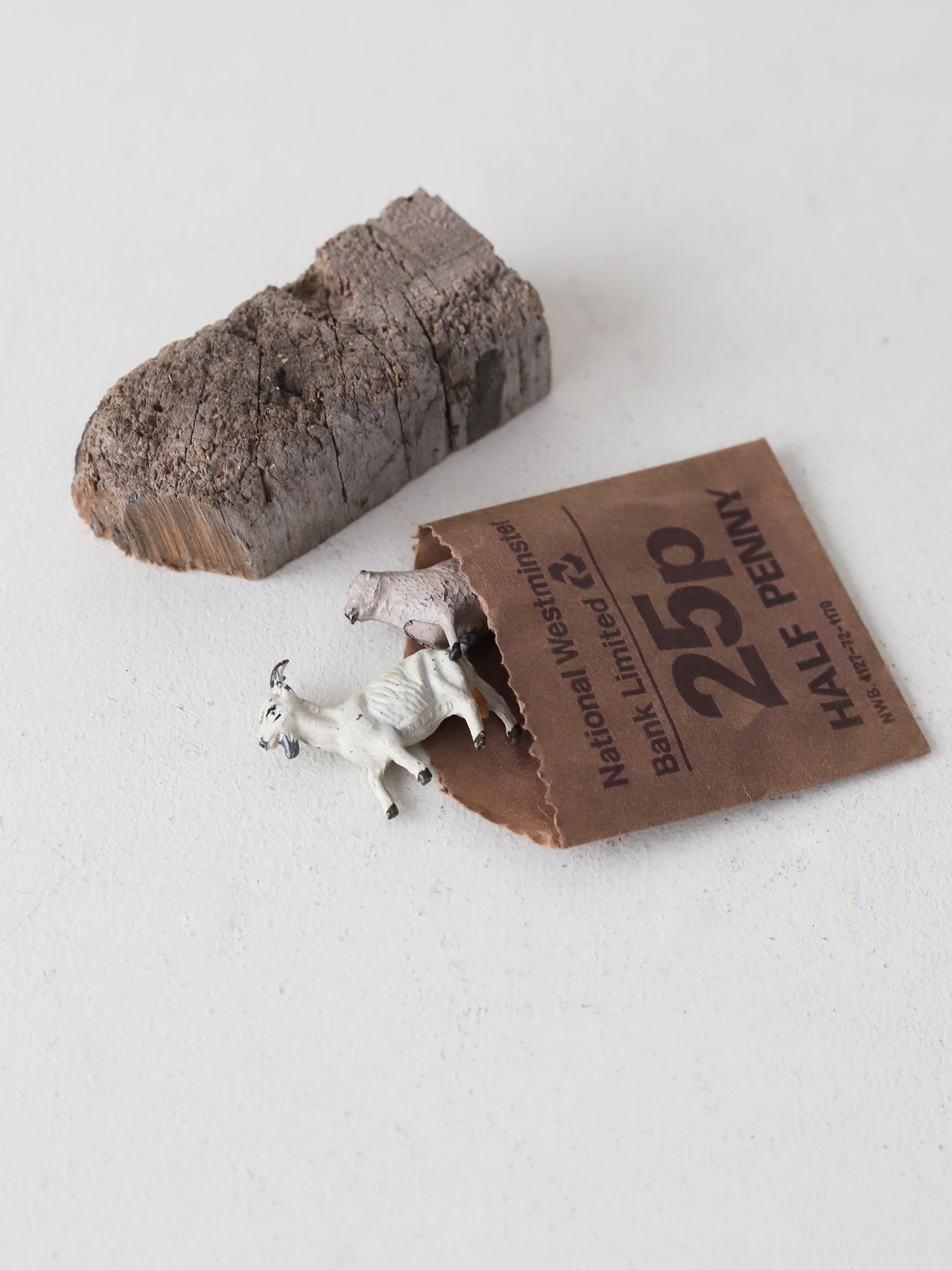 イギリスの鉛のヤギと羊。木端の端っこでお散歩中です。イギリスの銀行の硬貨袋に入れてお届けします。