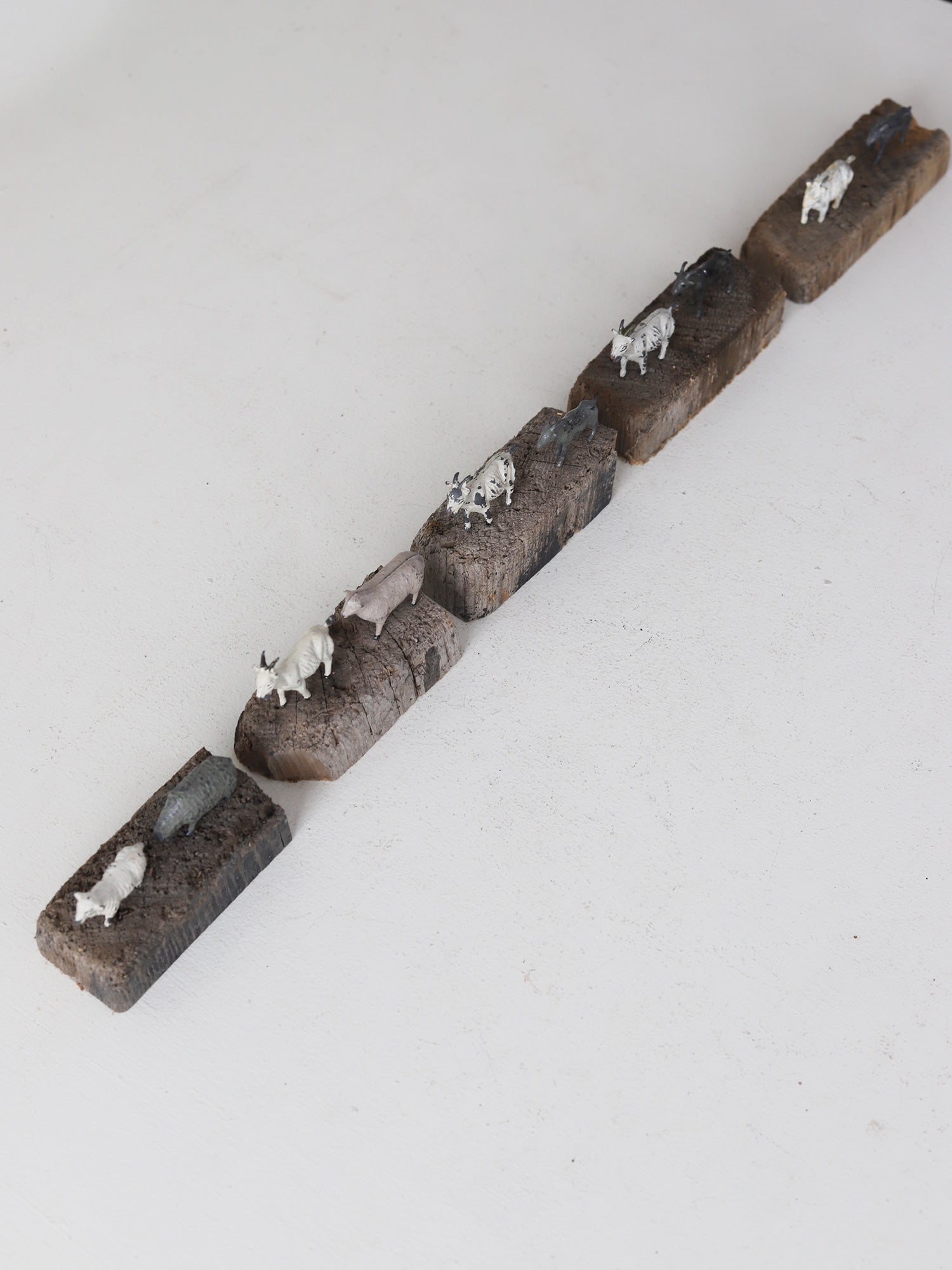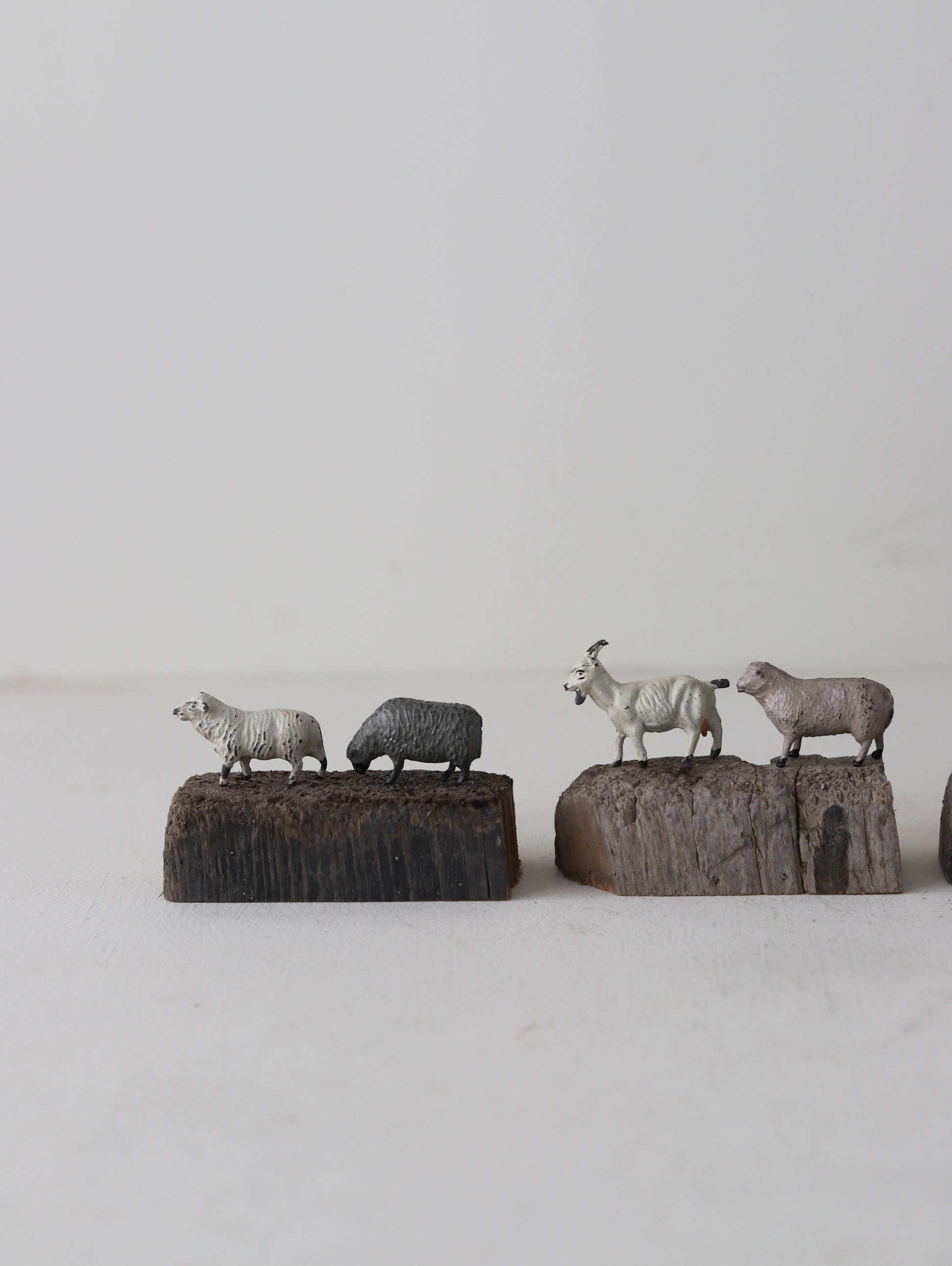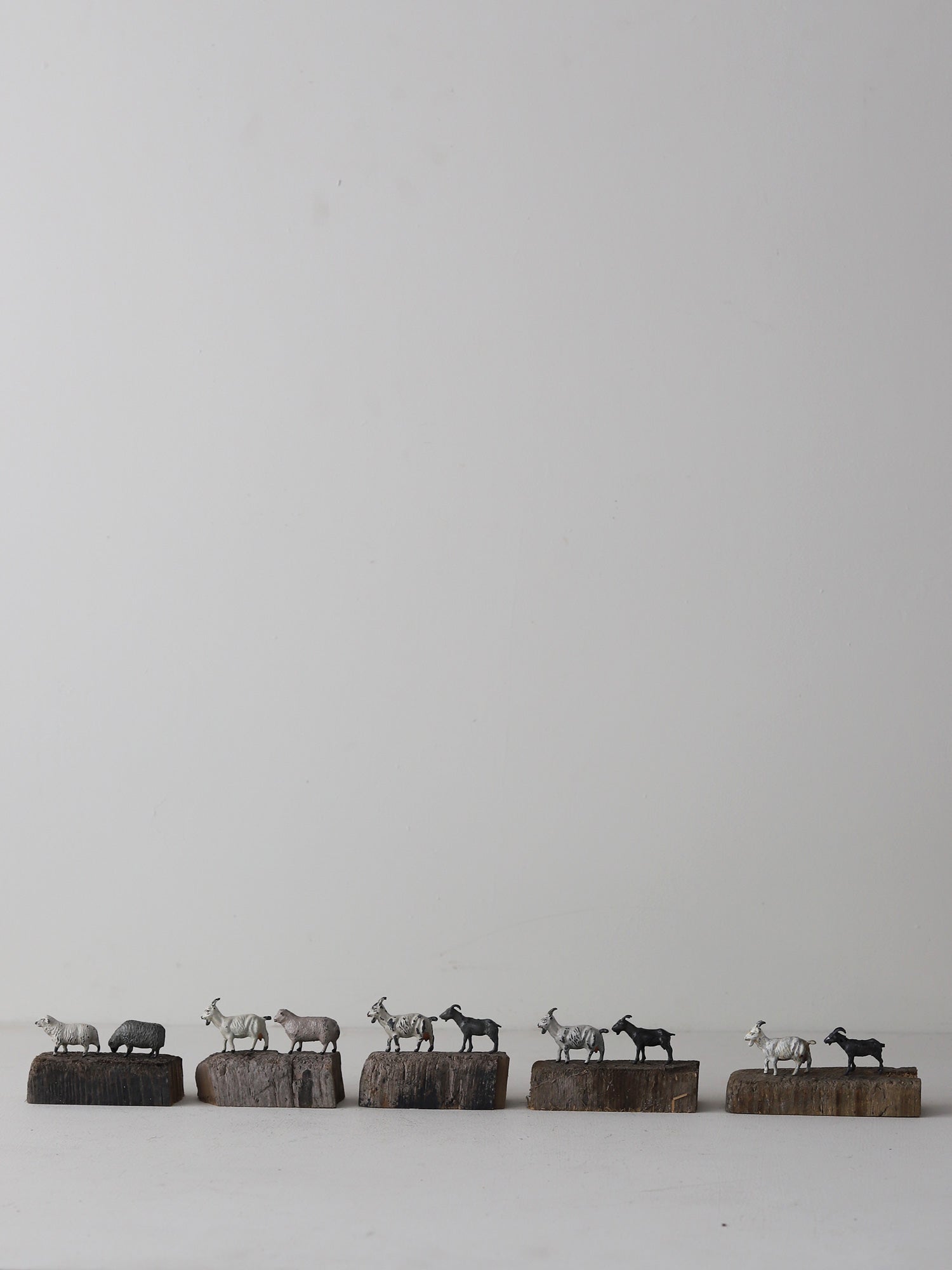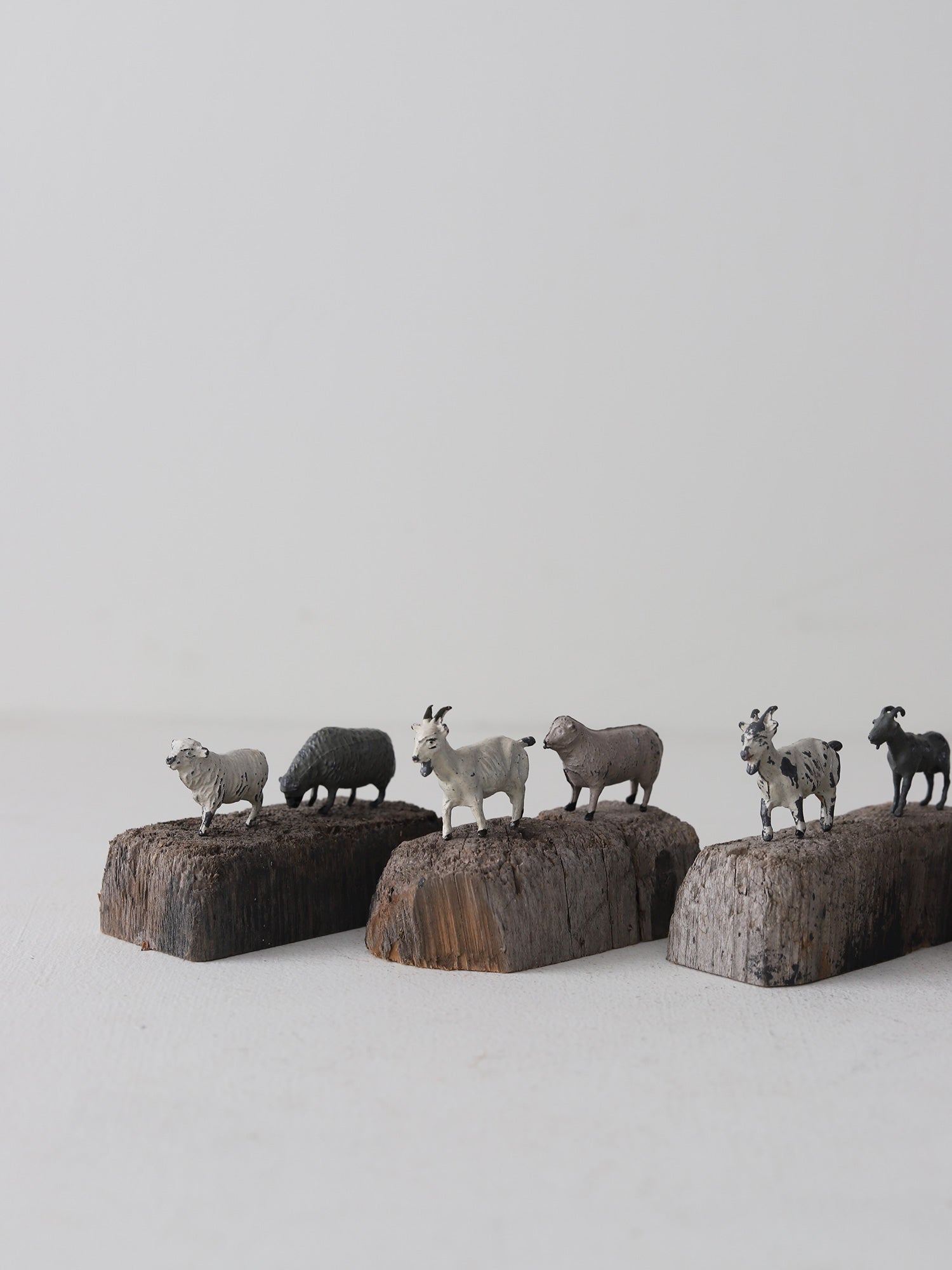 イギリスの鉛のヤギと羊。木端の端っこでお散歩中です。イギリスの銀行の硬貨袋に入れてお届けします。