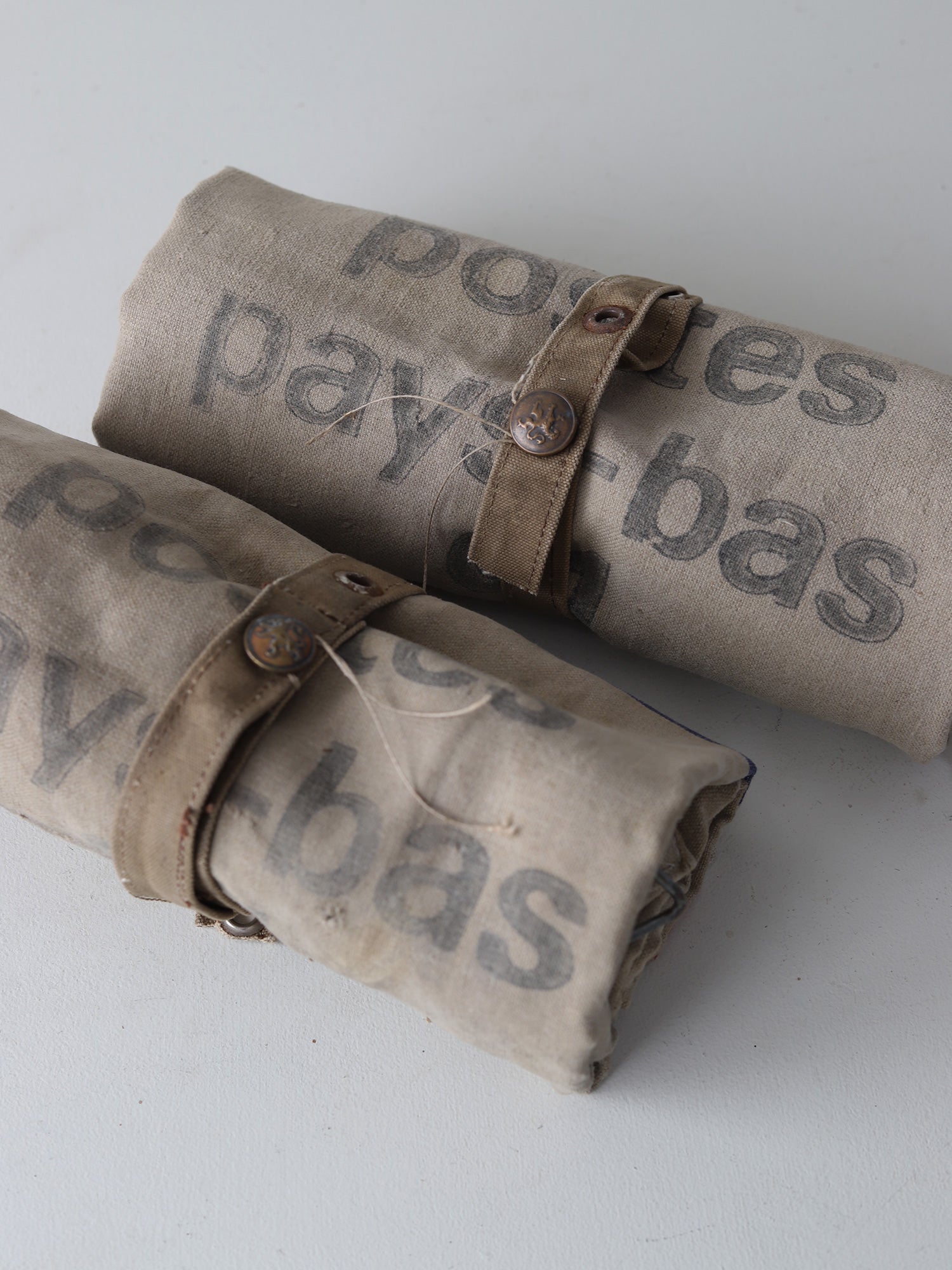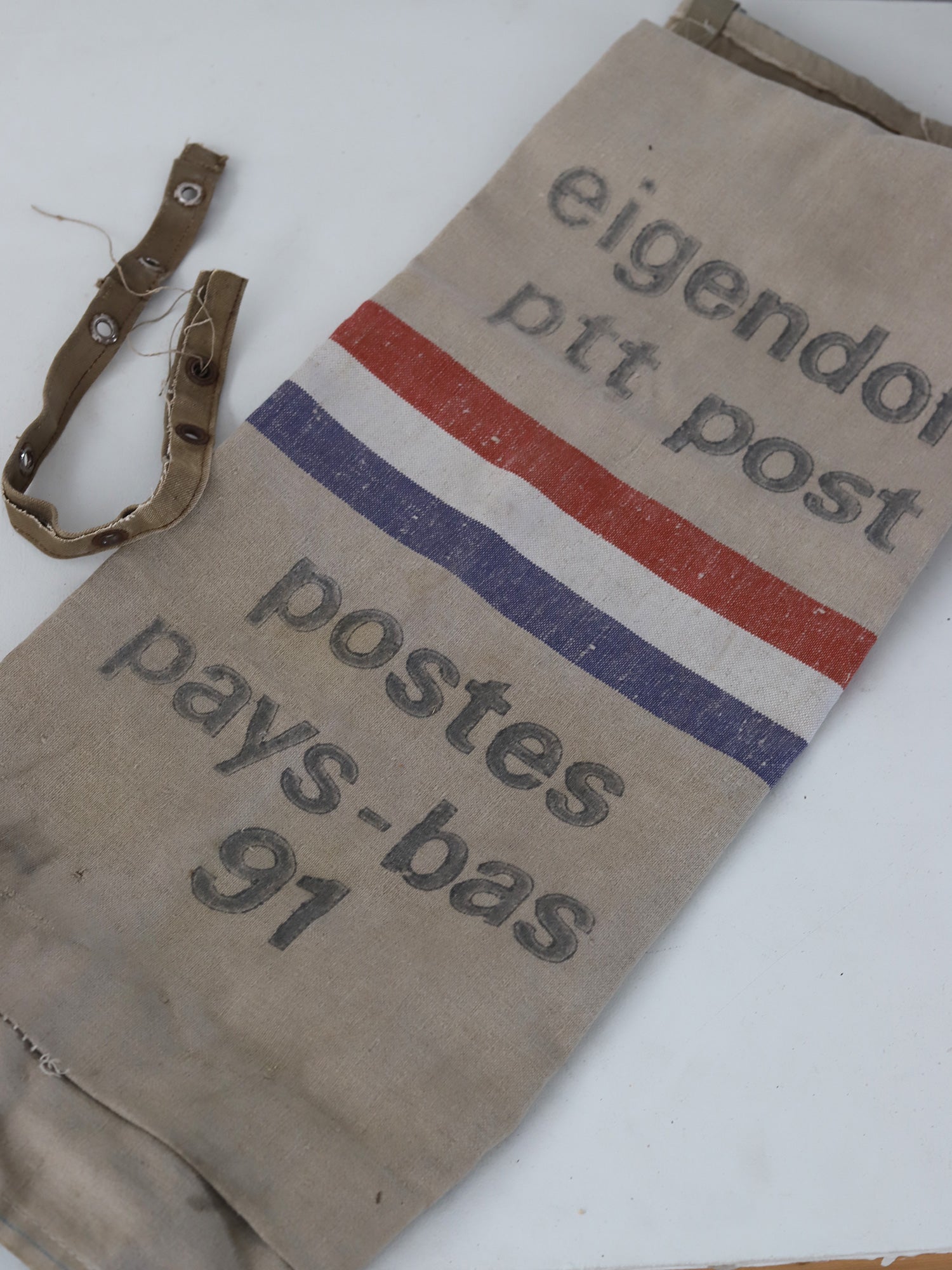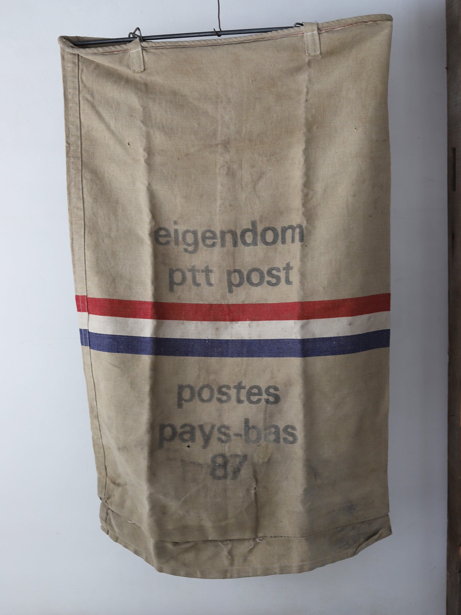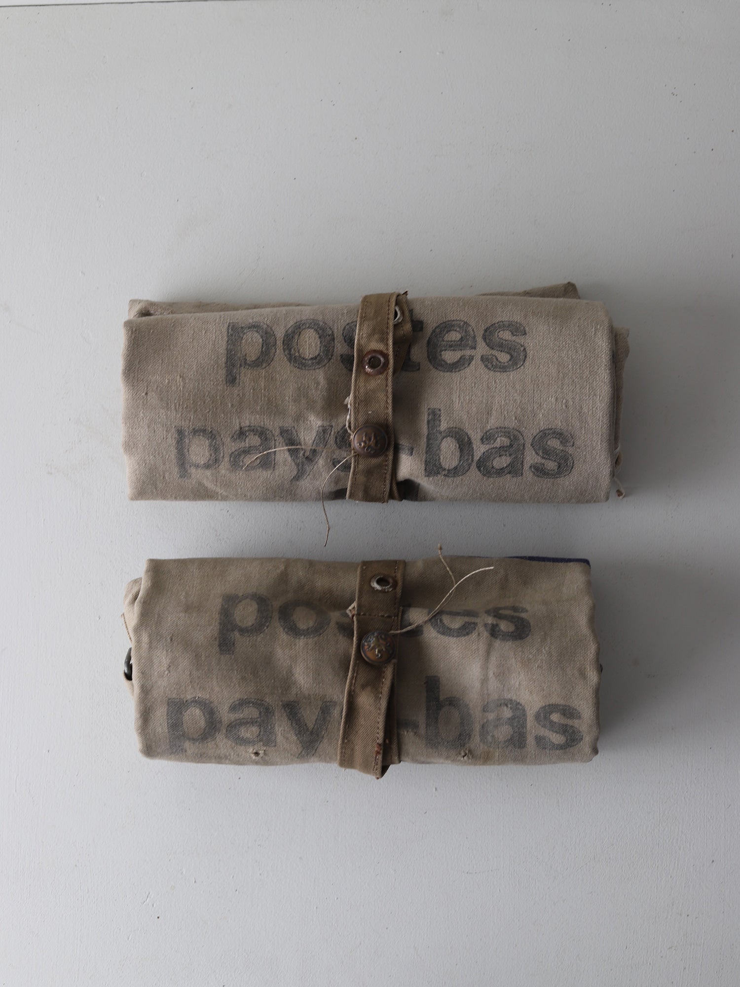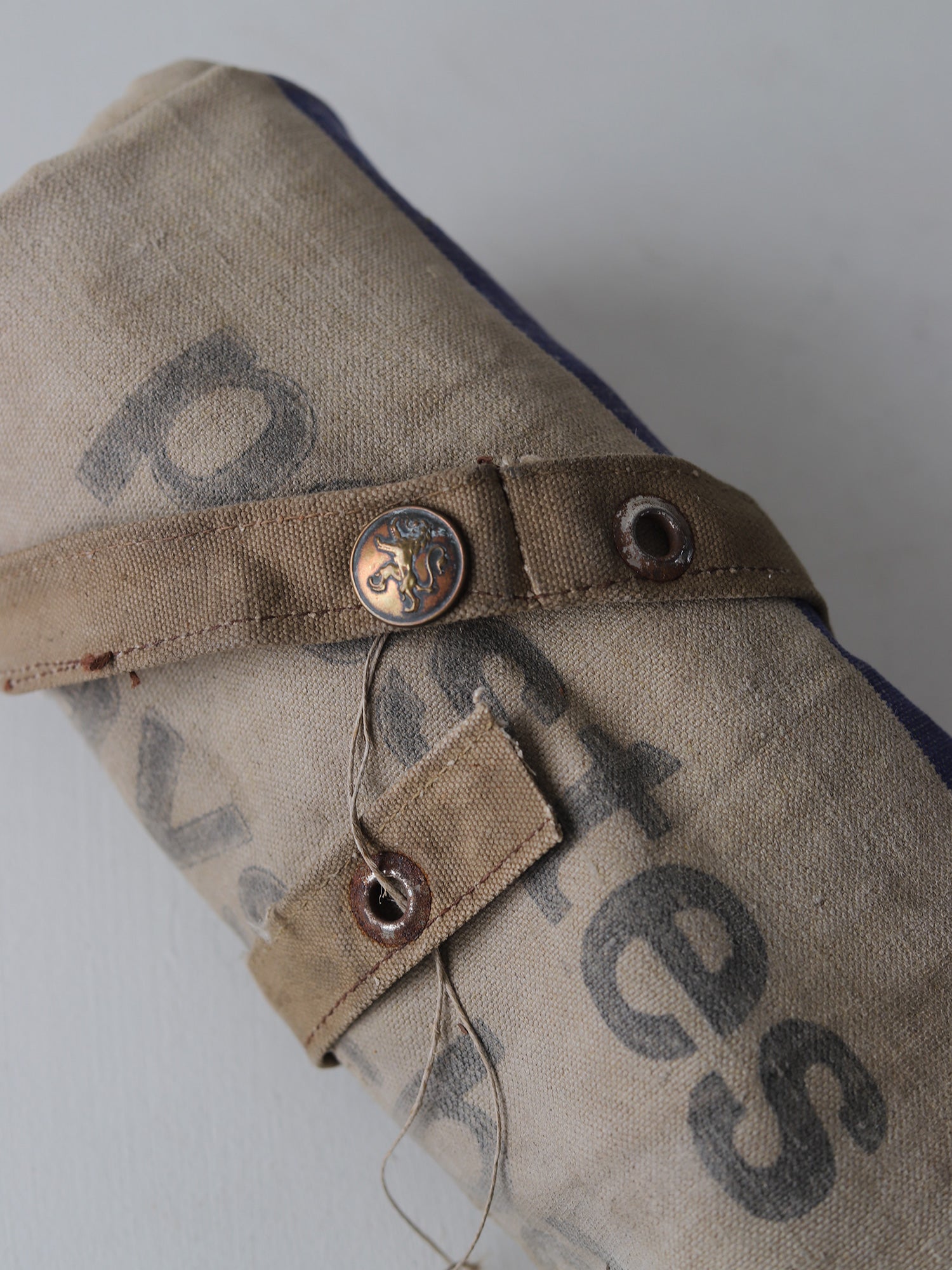 オランダのポストバック。しっかりした生地でとても丈夫です。いろいろ詰め込んで旅にでましょう。古いベルトをバンドにしてかっこいいボタンを付けたので使わない時はくるっと巻いて置いときましょう。巻いた状態がかわいいです。