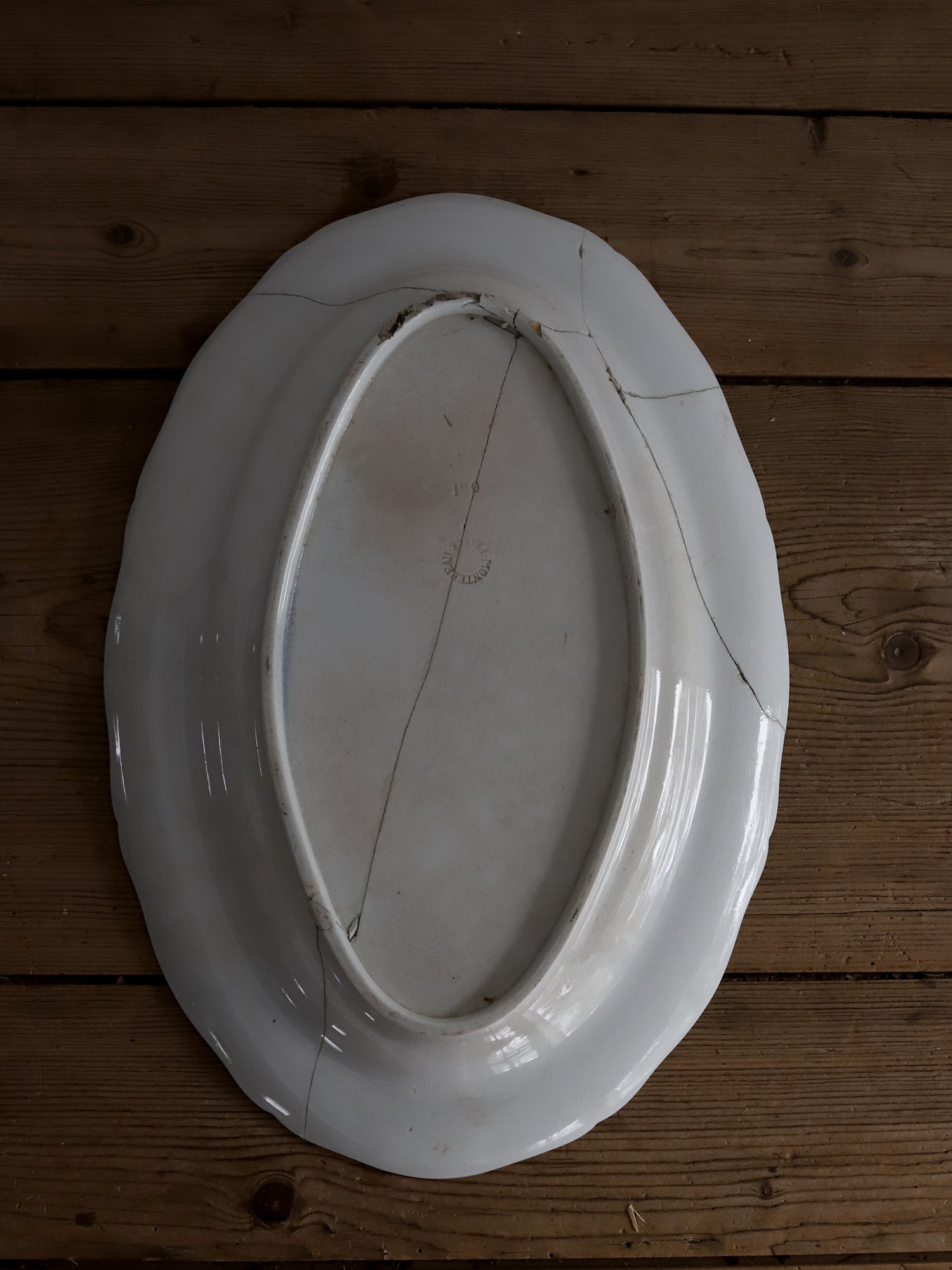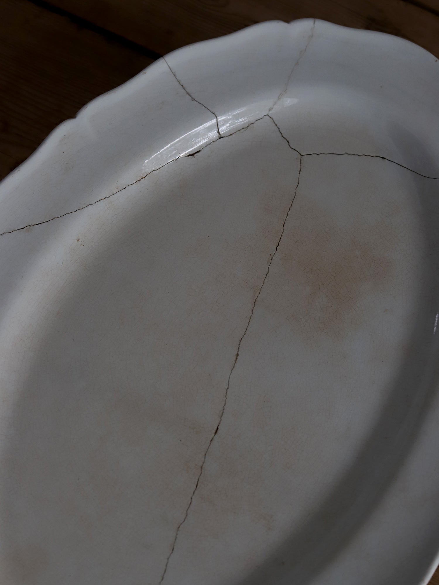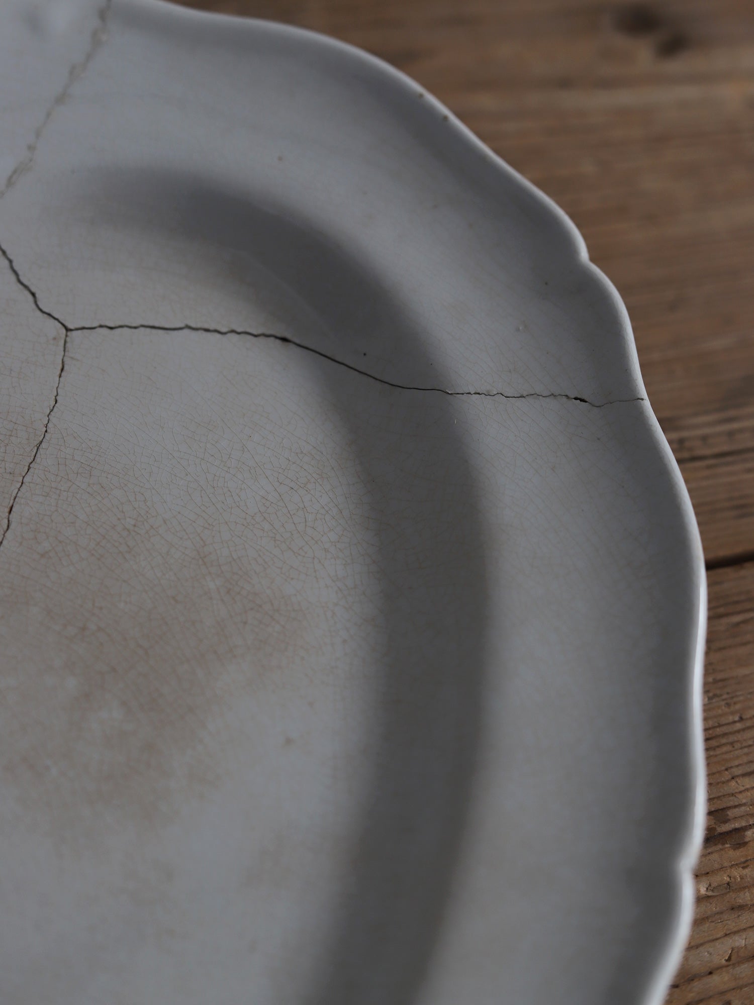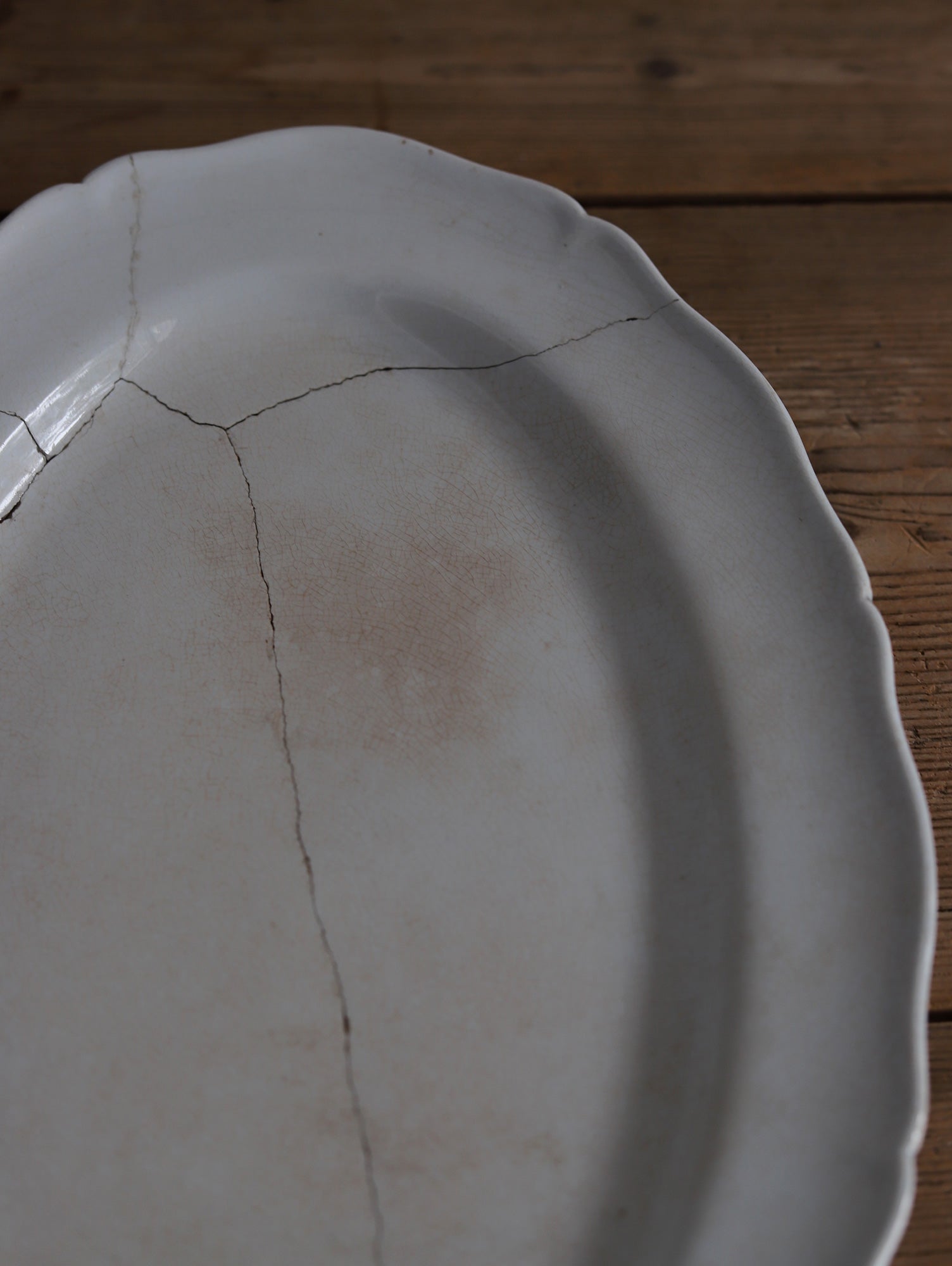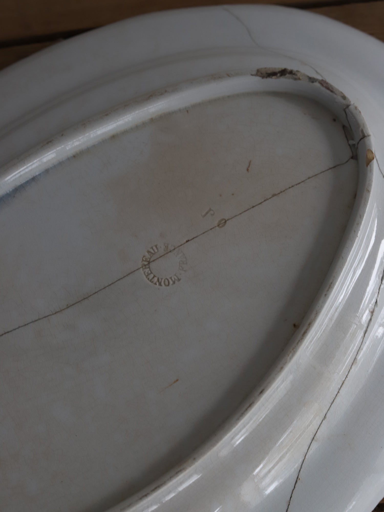 フランス、モントローのオーバル皿。お写真だと分かりづらいですが、ほんのりと淡い上品な水色っぽい色味です。細かい貫入と、経年の色味がとても雰囲気のあるお皿。ヒビ・ワレの修復跡あり、金継ぎなさるか、焼き菓子の盛り付けなどに良いかなと思います。