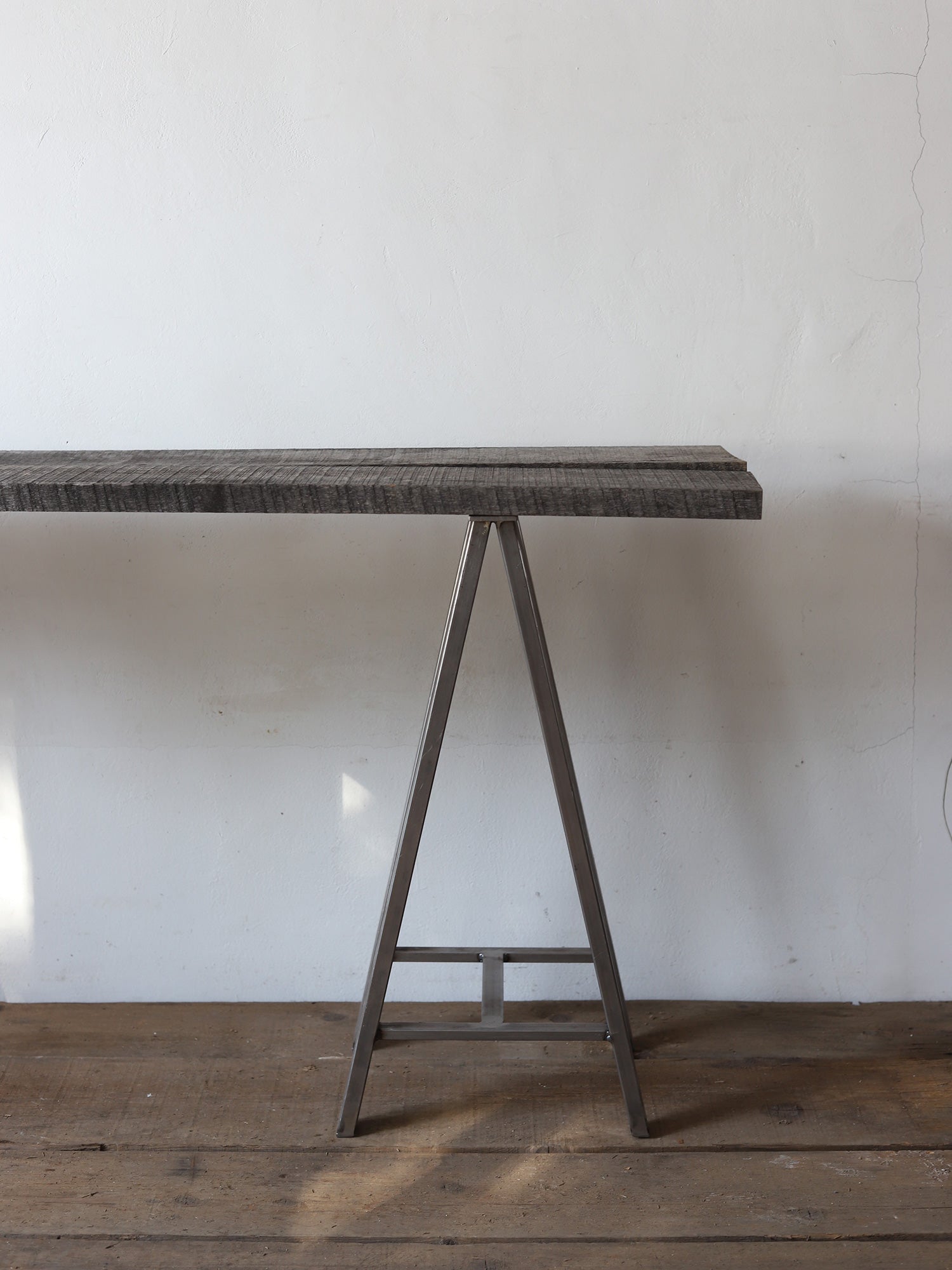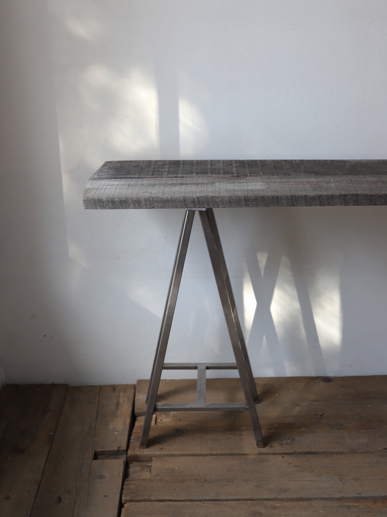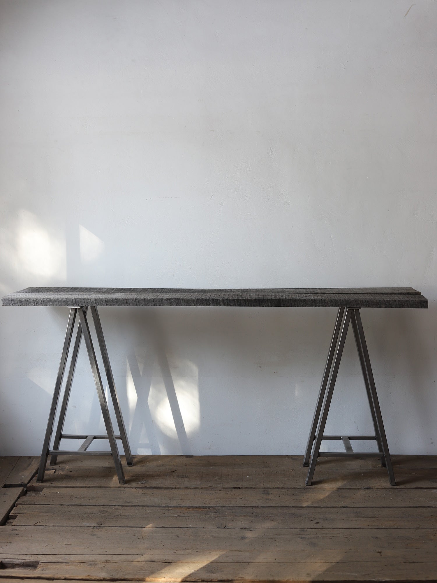 楢の古材はいつか使おうと取って置いたもの。経年によりシルバーに変化してとても美しい色合いです。今回のテーブル脚もシルバーなのでとても相性がよく、すっきりとスマートなテーブルになりました。テーブルとして、作業台として、ディスプレイ台としていろいろな使い方をしてください。
