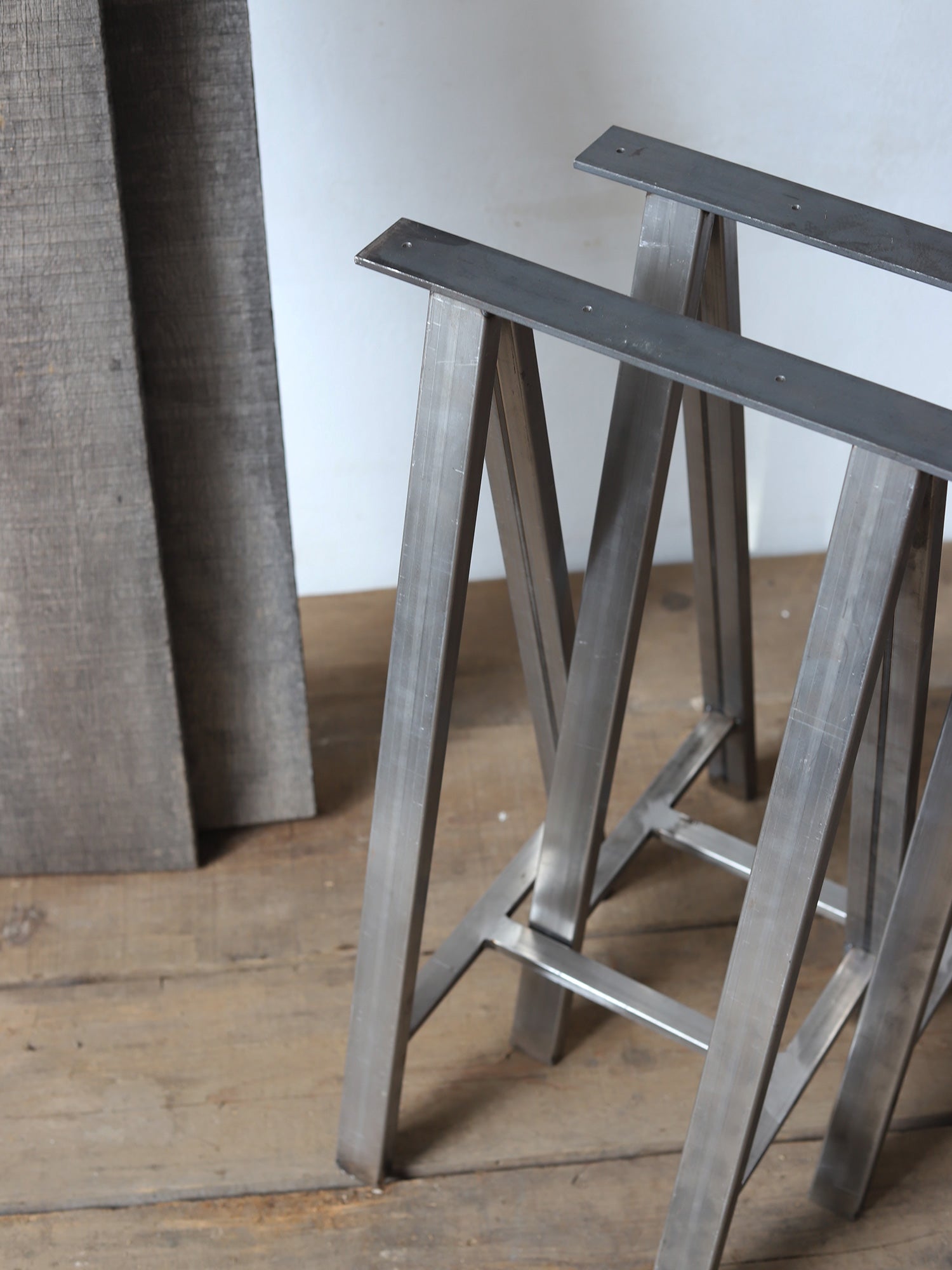 FIVEオリジナルのソーホース(作業台脚)に楢の古材を合わせてテーブルに。