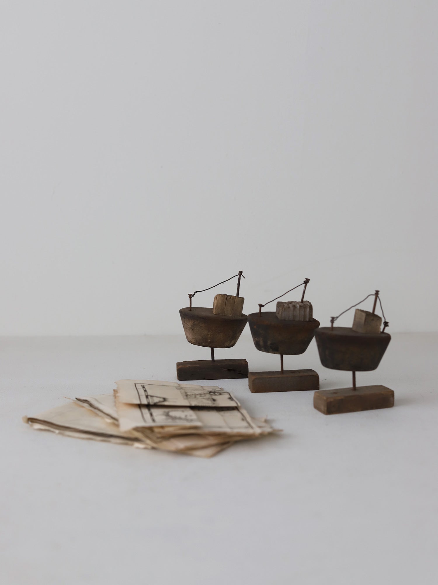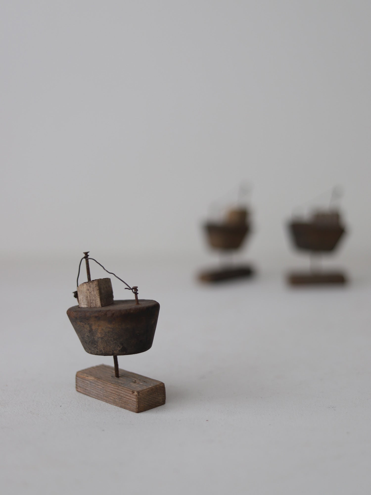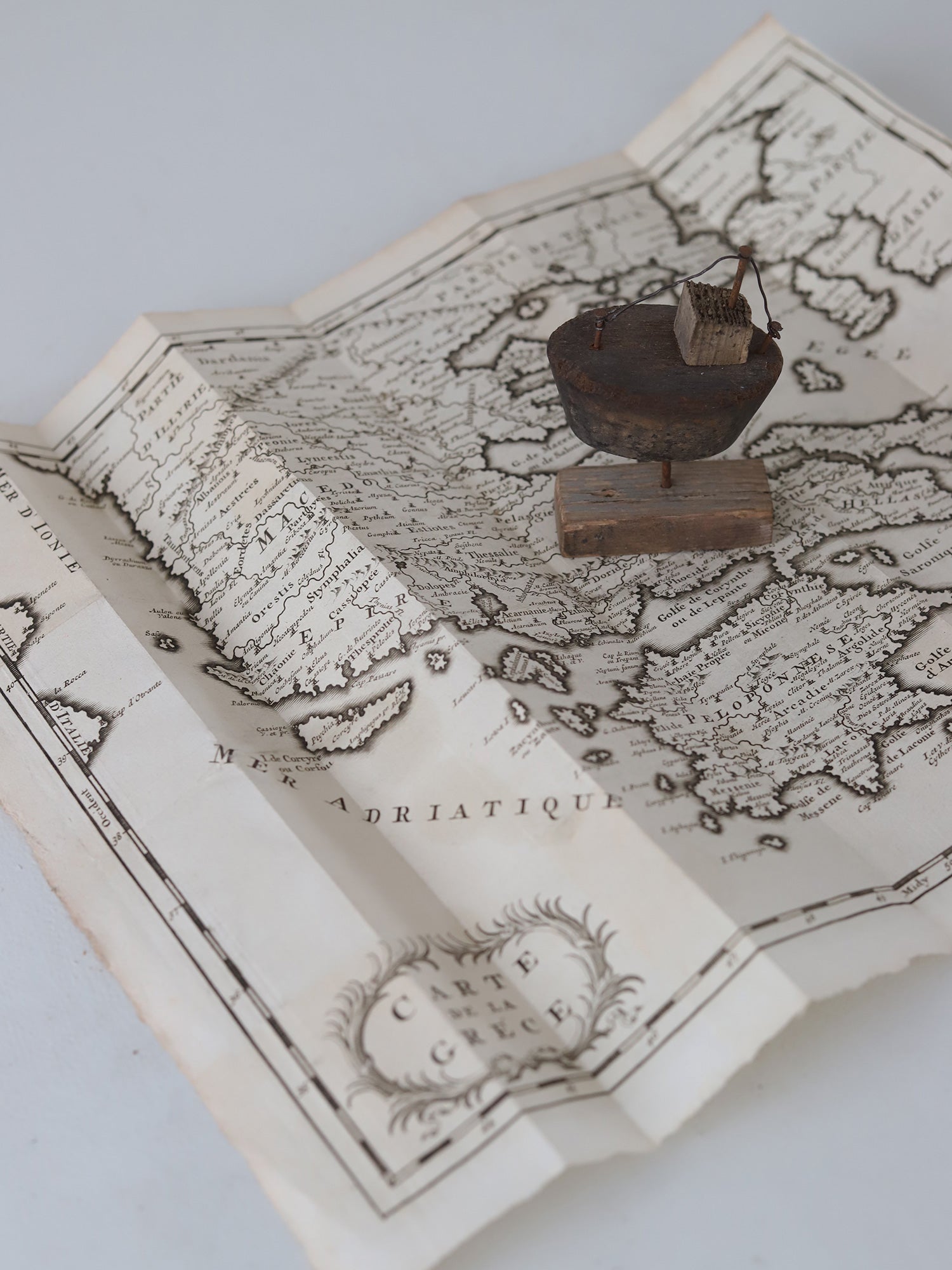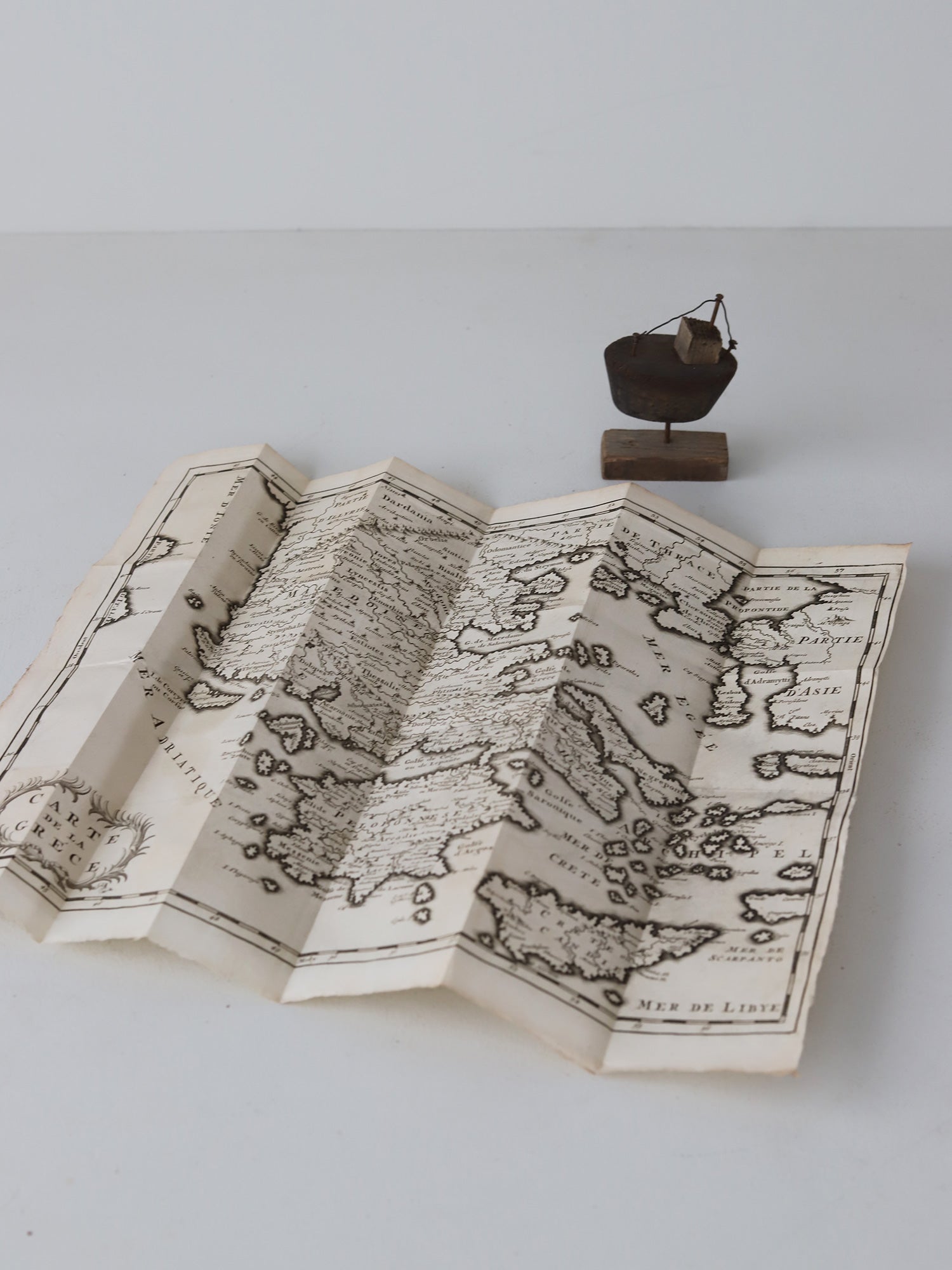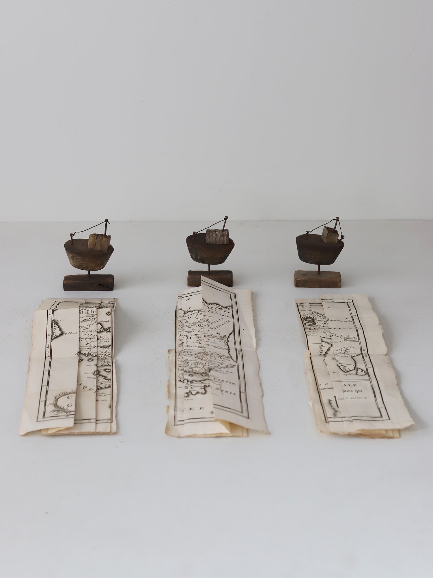 ボロな船と古い地図のセット。船はフランスで見つけたお菓子のモールド(船の胴体部分)を使って作りました。とてもかわいらしい船です。渋い地図は中世の航海を感じさせます。船と地図を見ながら航海に思いを巡らせてください。