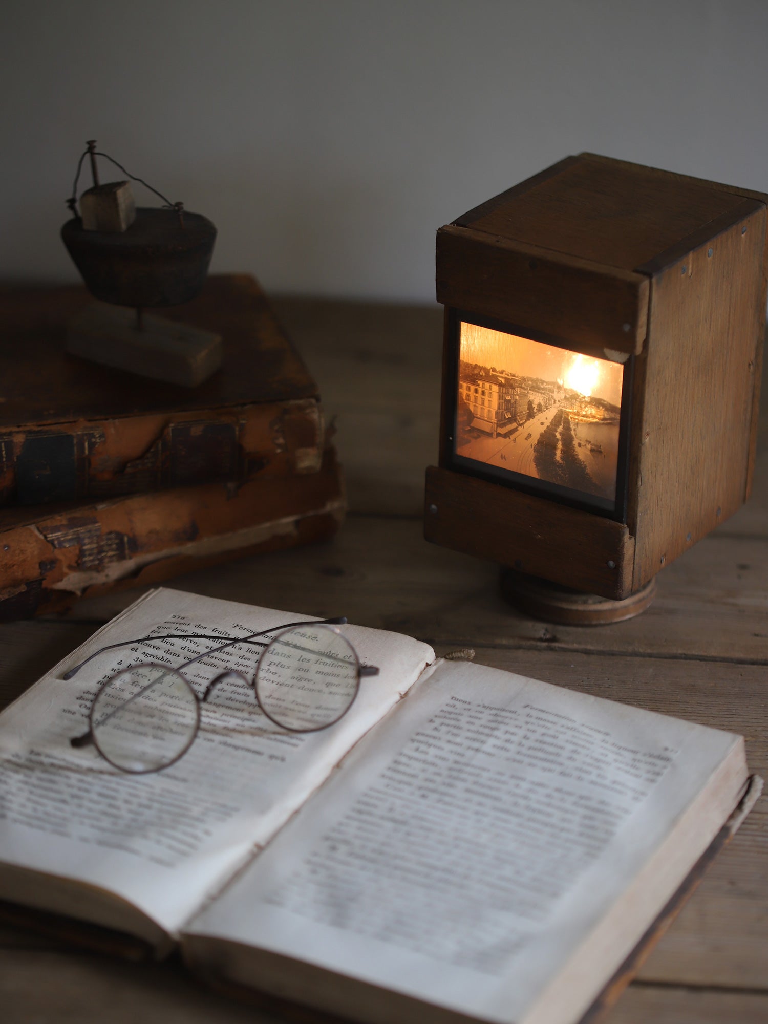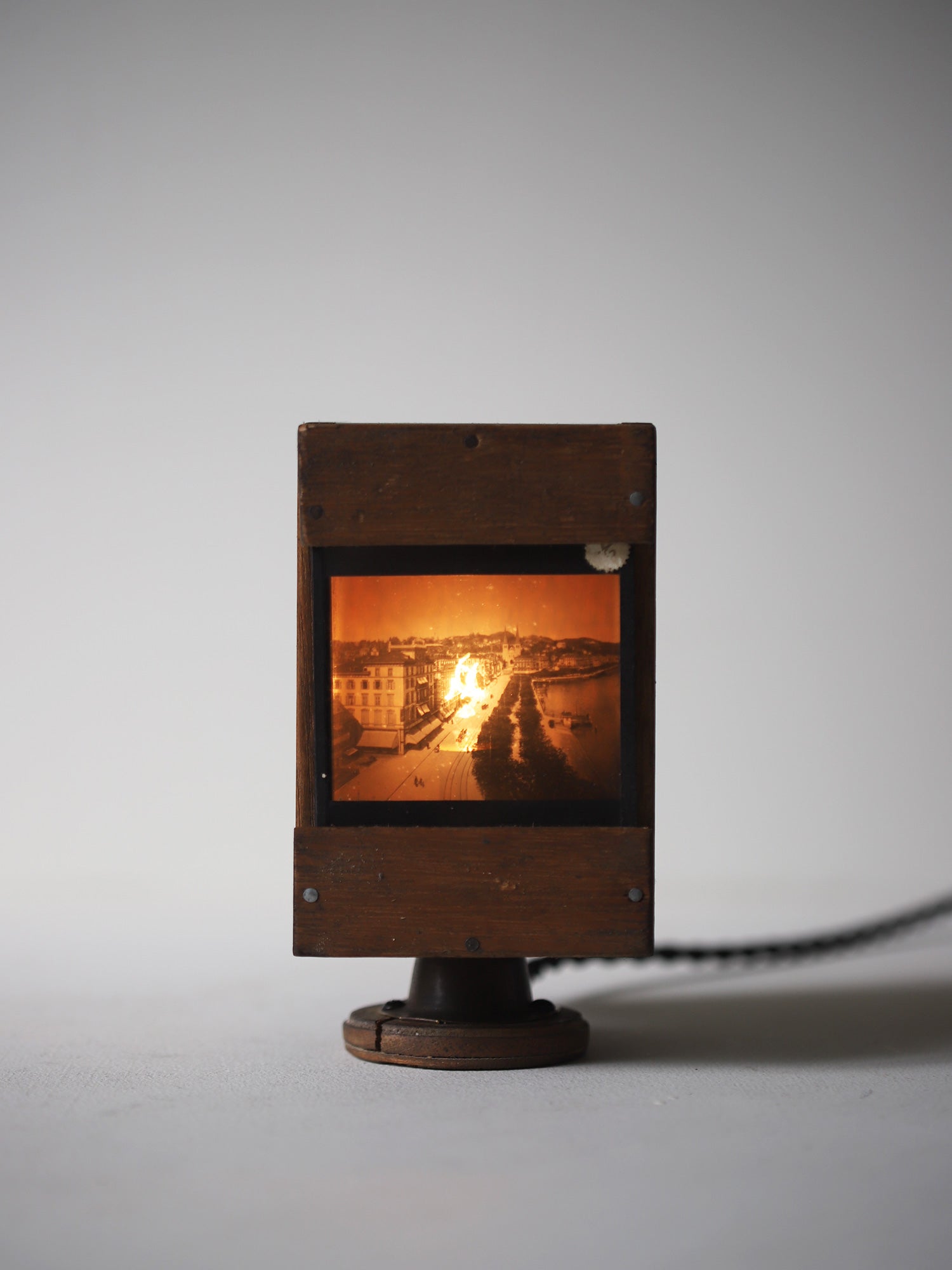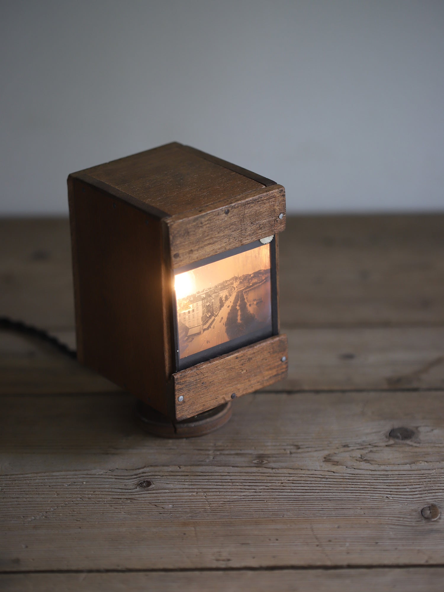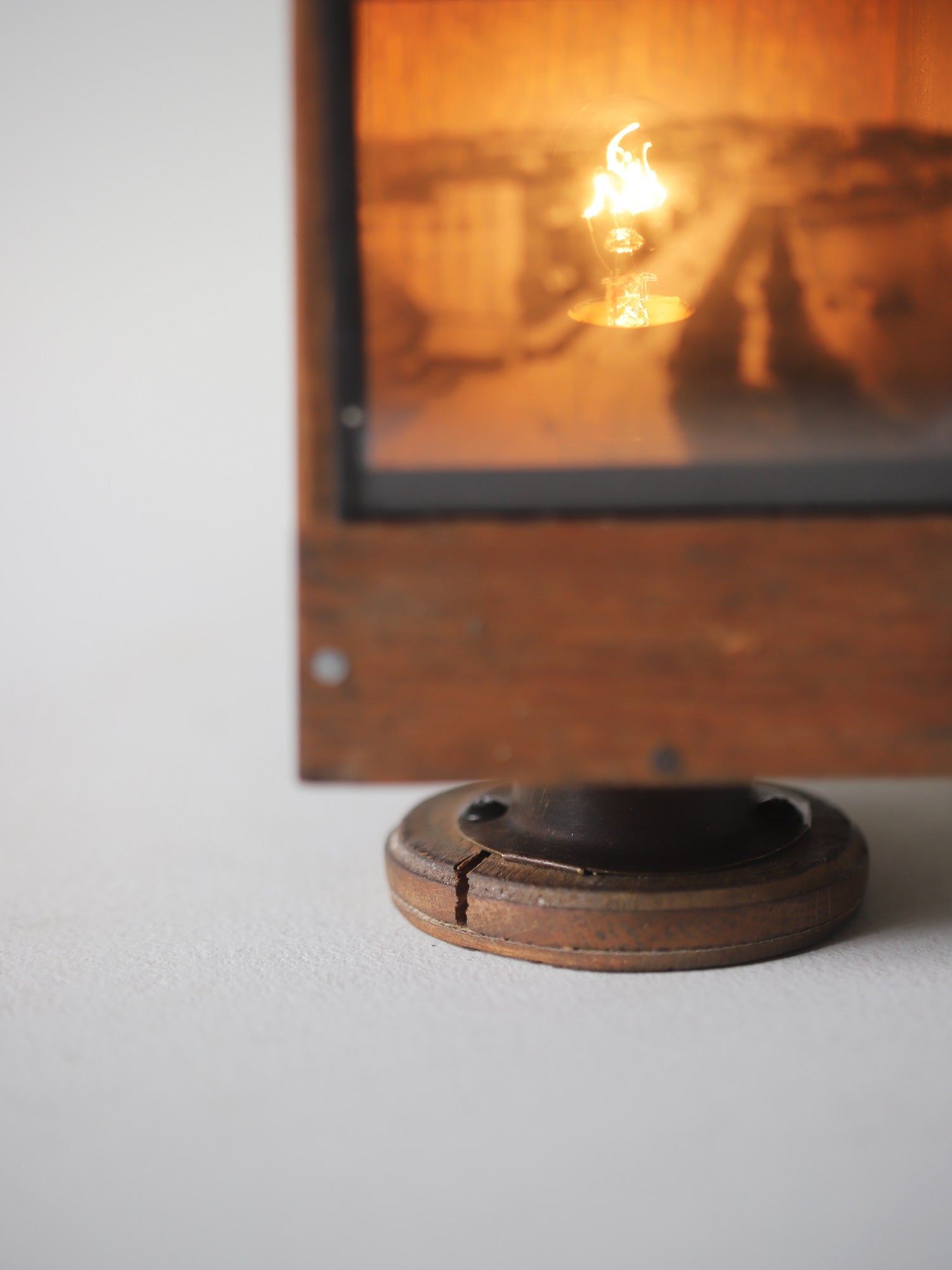 ガラスフィルムが綺麗に見えるようにできないかなと考えていて、これに行きつきました。小さな木箱にランプをつけてちょっとノスタルジックな雰囲気です。角度によっては夕日に照らされた街並みに見えます。