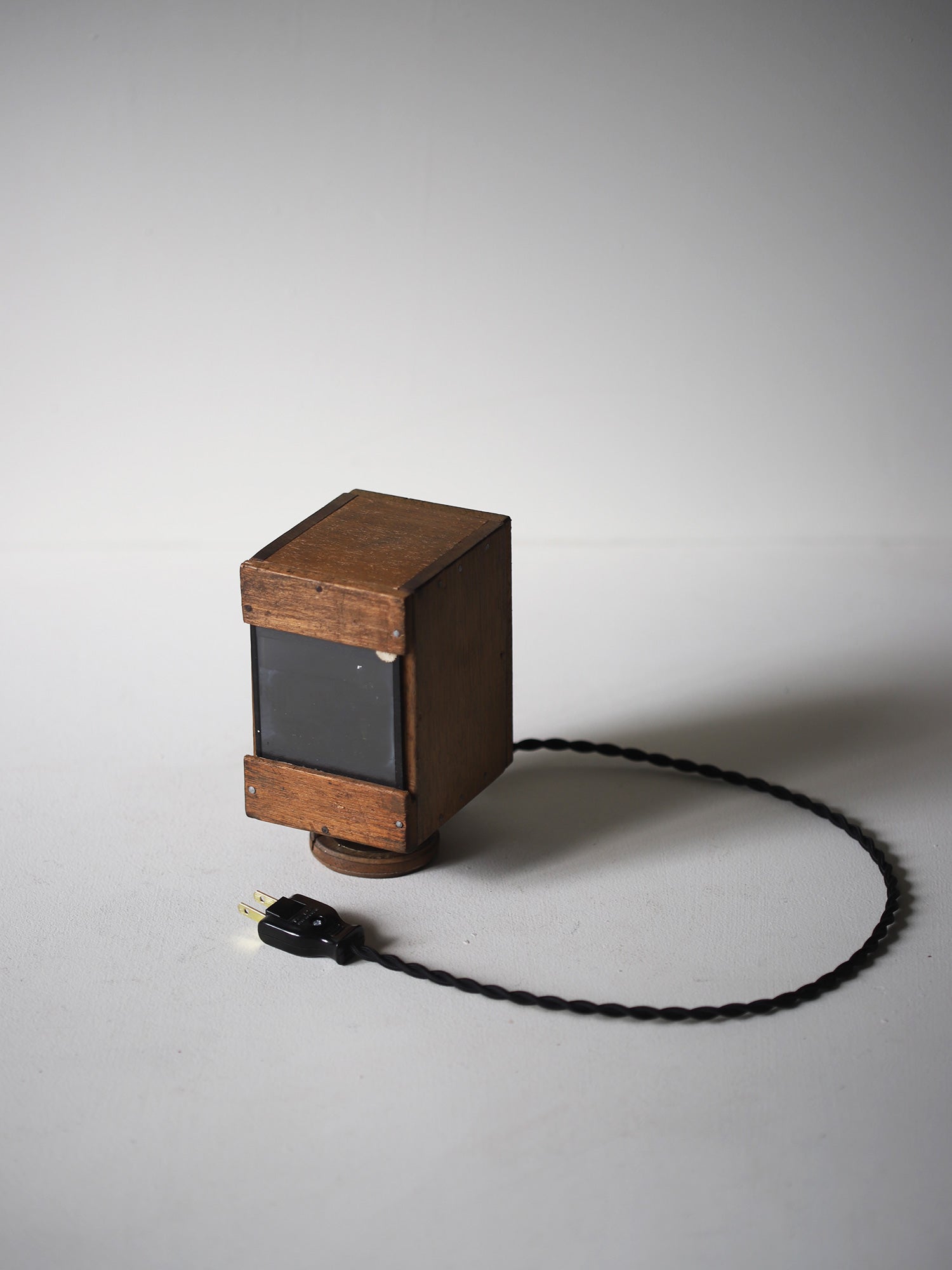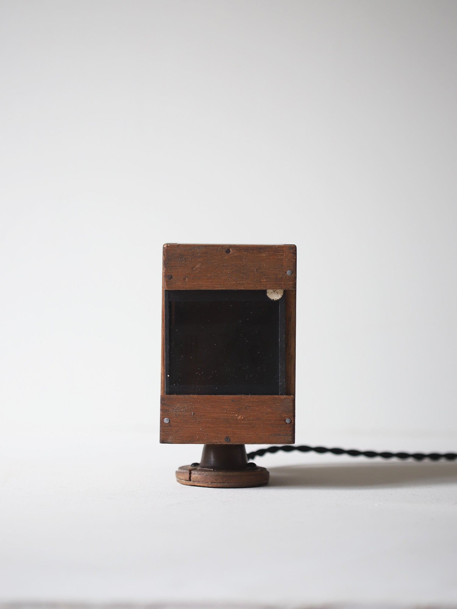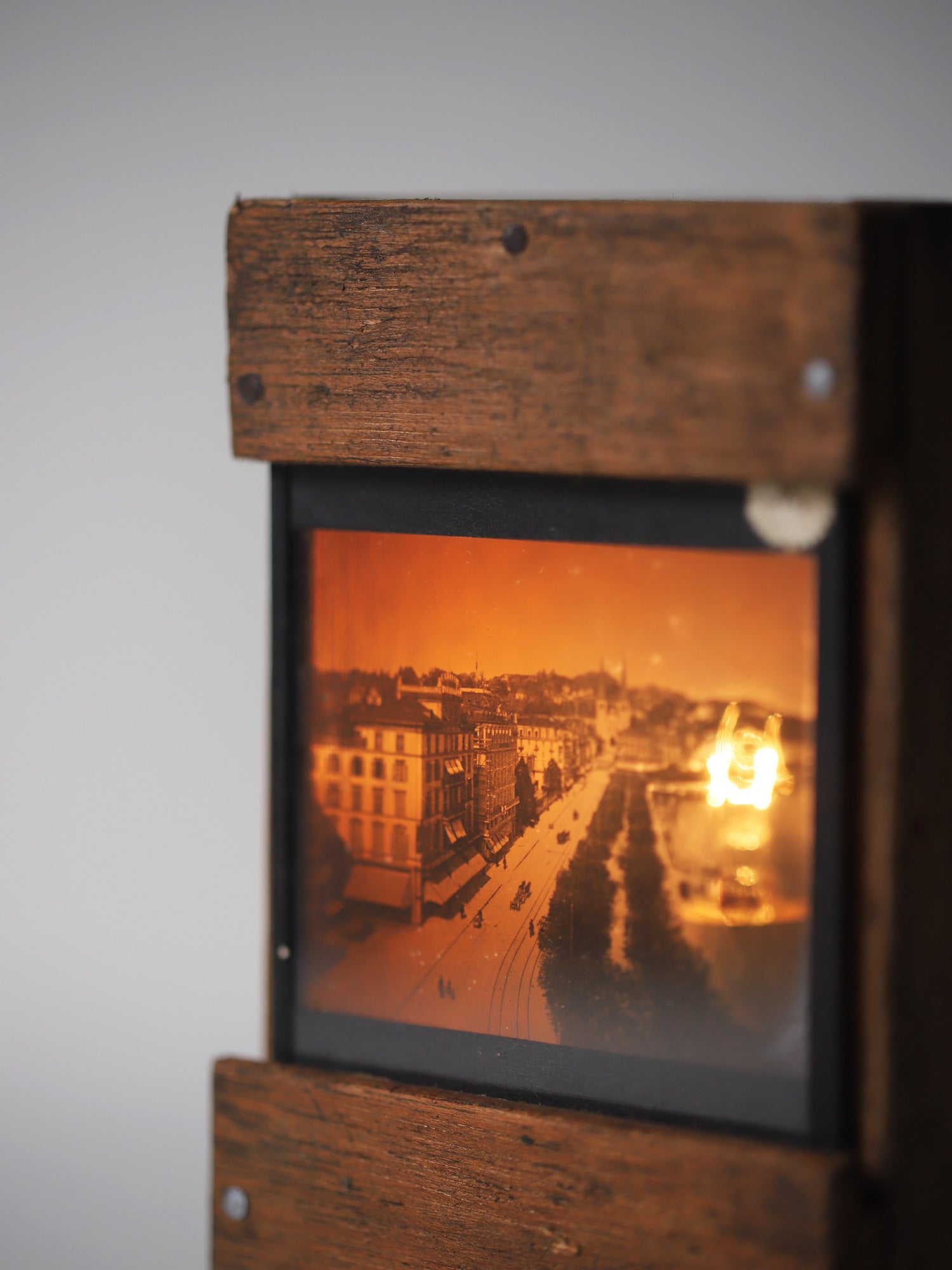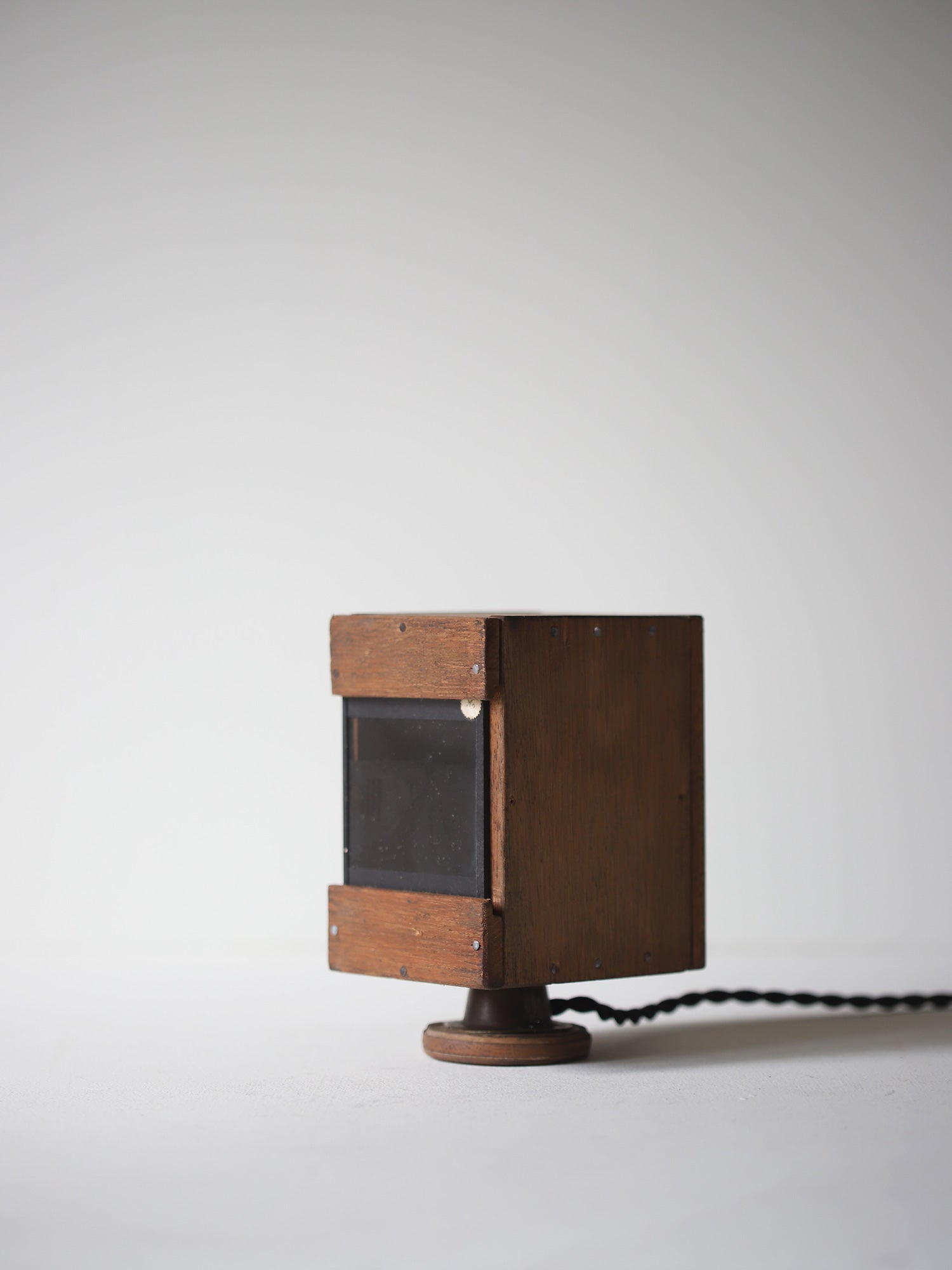 ガラスフィルムが綺麗に見えるようにできないかなと考えていて、これに行きつきました。小さな木箱にランプをつけてちょっとノスタルジックな雰囲気です。角度によっては夕日に照らされた街並みに見えます。