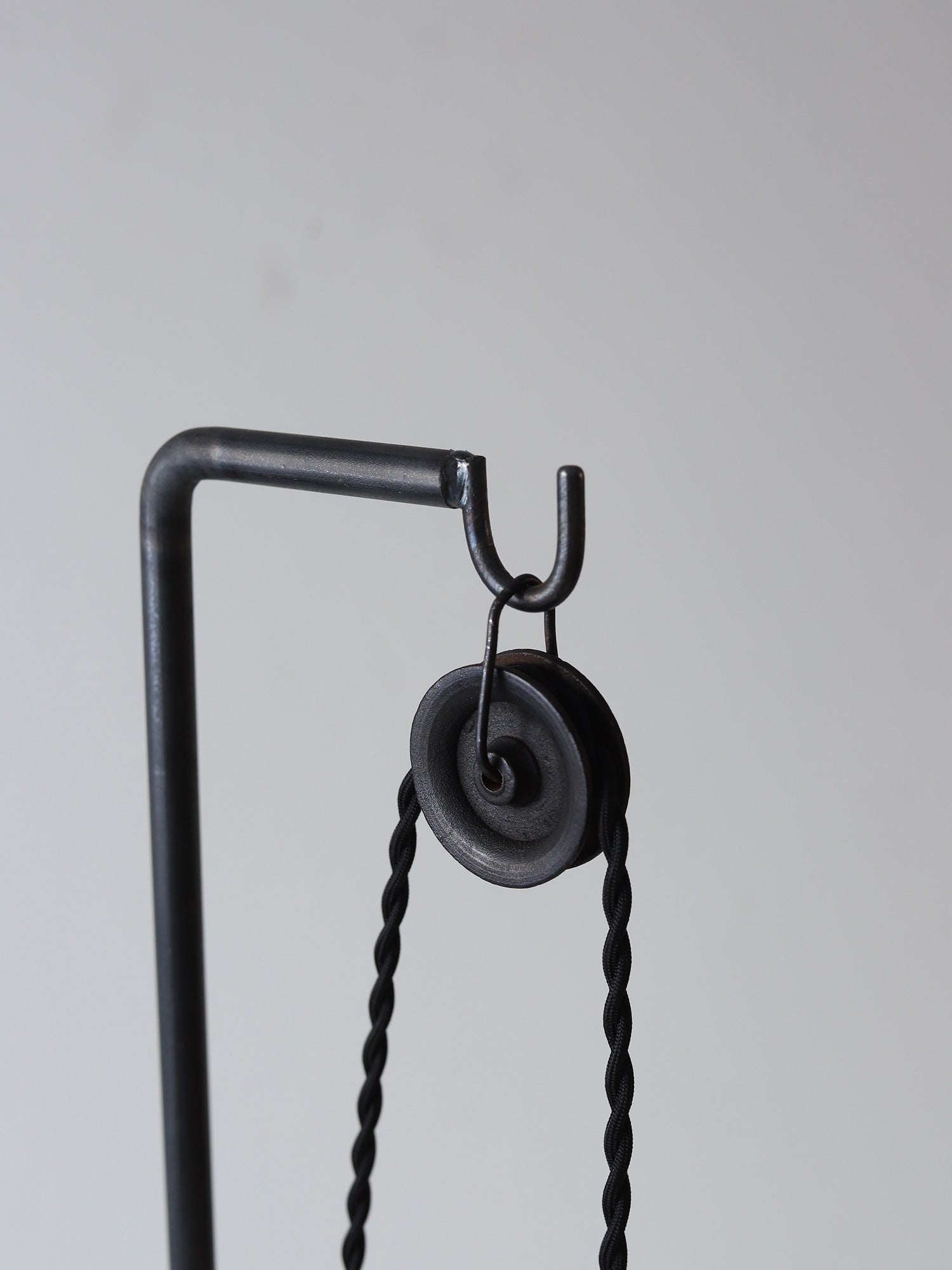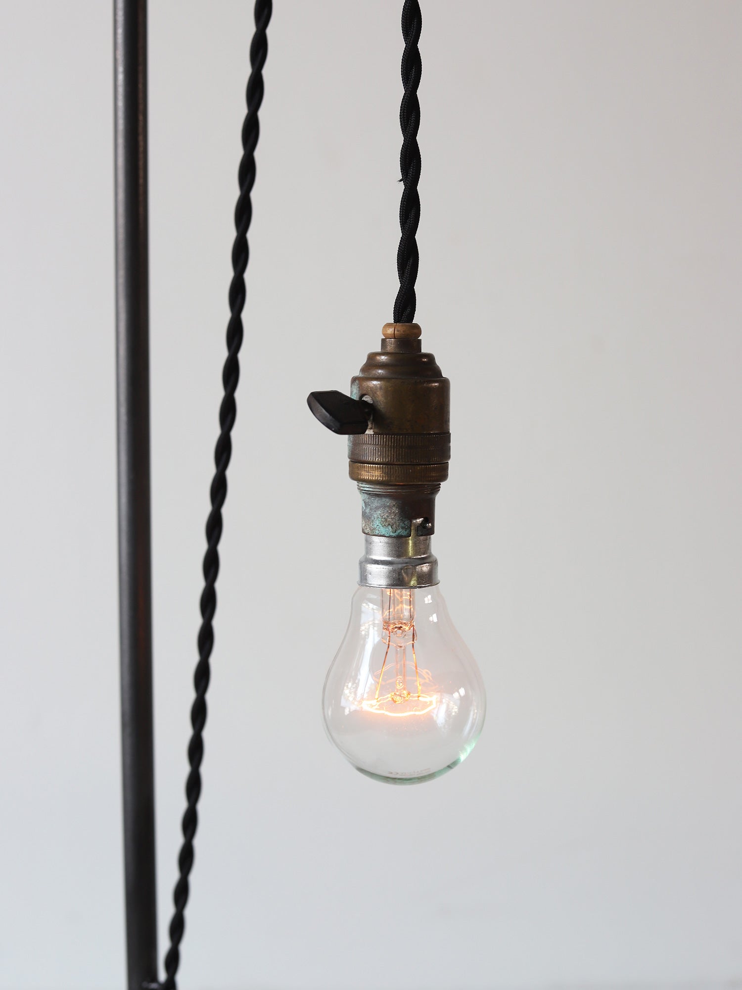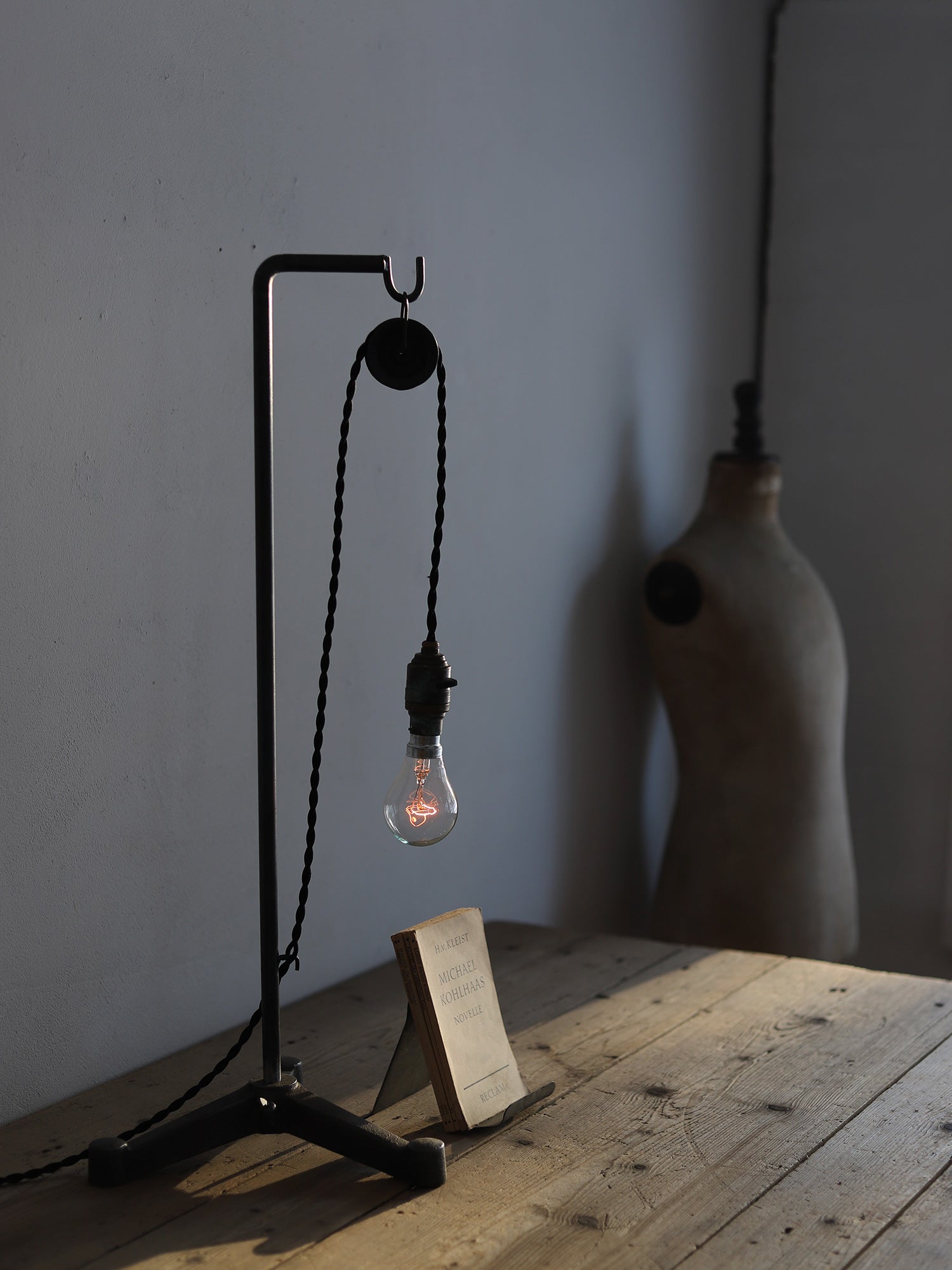 実験道具のスタンドベース(日本製)があったのでL字のバーを制作してランプのスタンドにしました。鉄の滑車も取り付け、その先のランプは古いフランスのスイッチ付きソケット。真鍮製で少し緑青が見られて渋い雰囲気です。なによりスイッチが付いているのが素晴らしいです。スタンドもバーも滑車もアイアンなのでとても重厚なランプになりました。バーにはコードを引っ掛ける小さなフックがこっそり付いてます。写真のヨーロッパの電球をお付けします。フィラメントが繊細で美しいです。