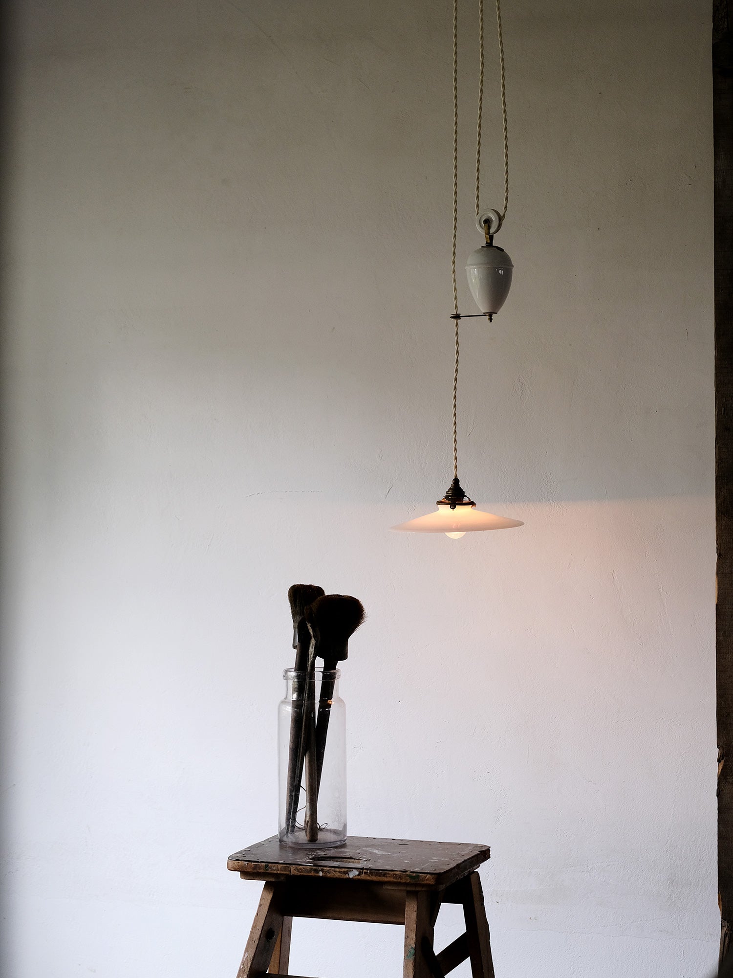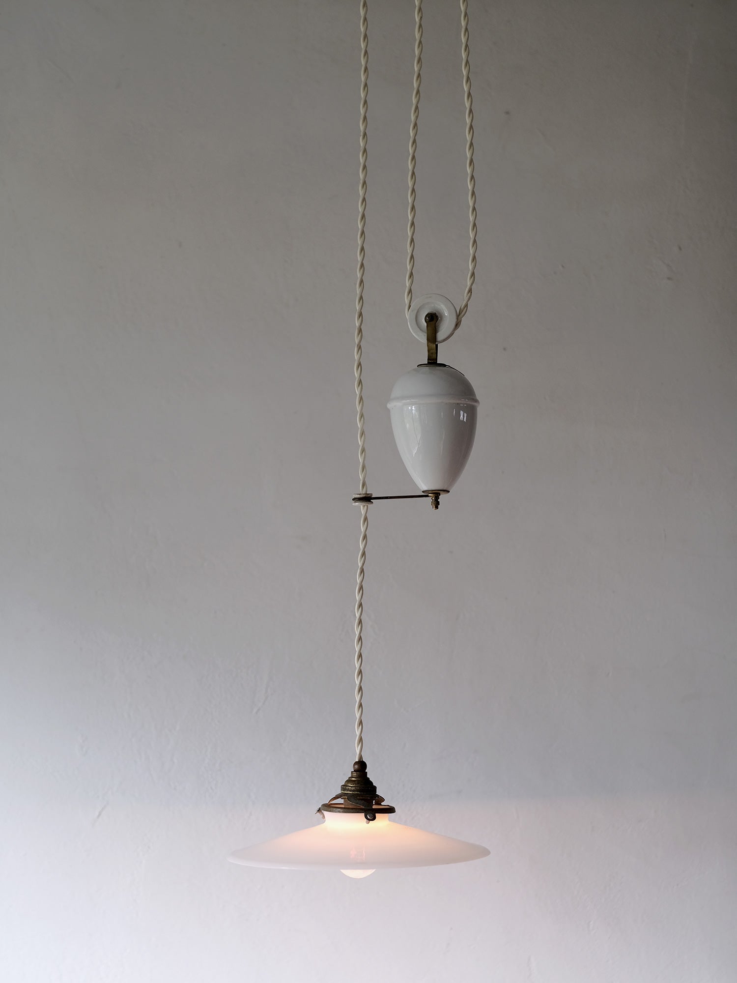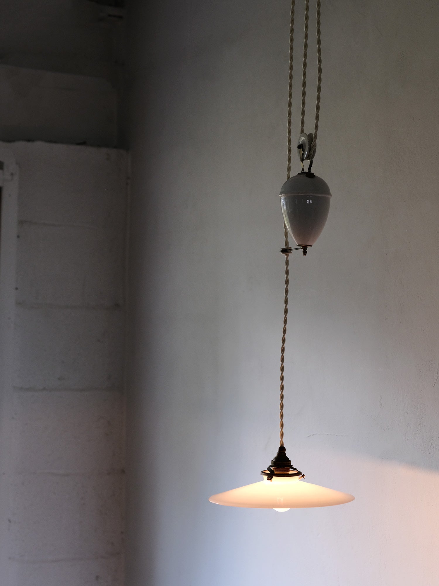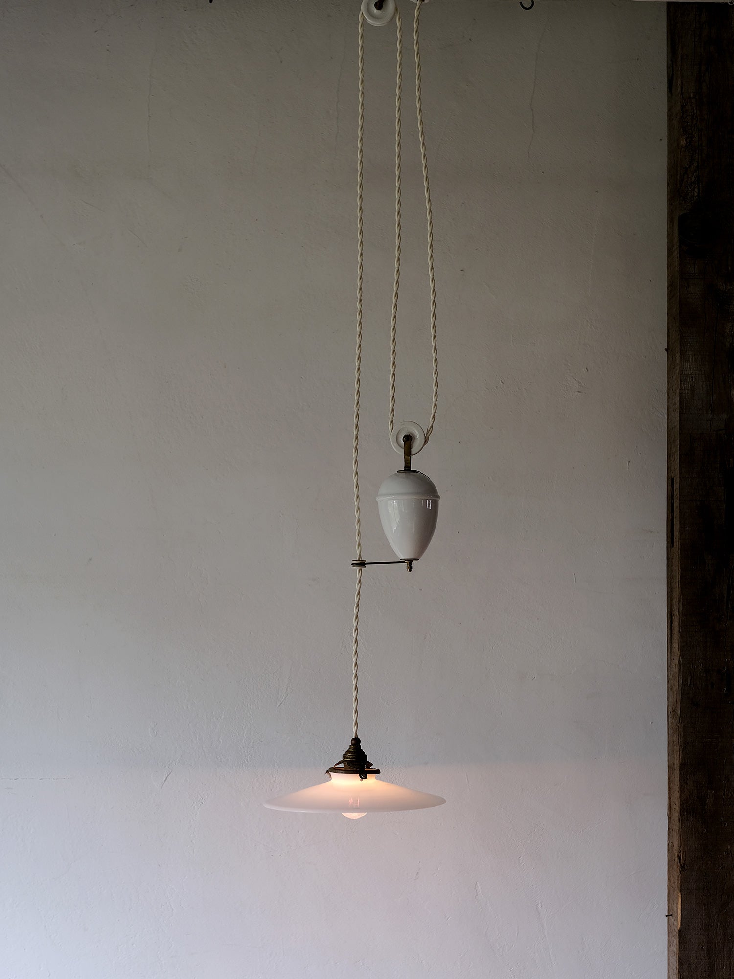すっきりとした白磁のオモリに、渋い色合いの真鍮のソケットとギャラリー、乳白色のガラスシェードを合わせて昇降式のランプを作りました。