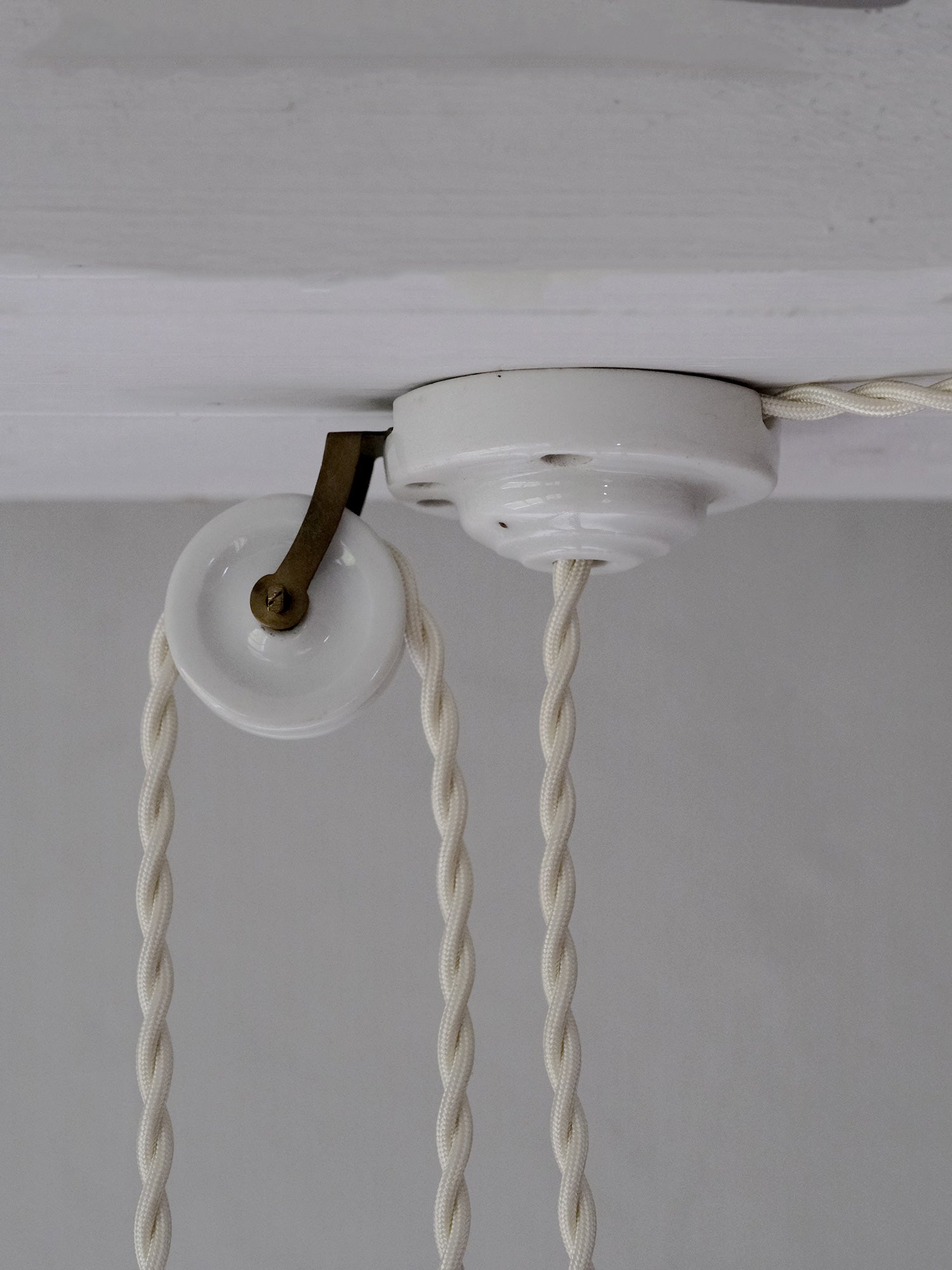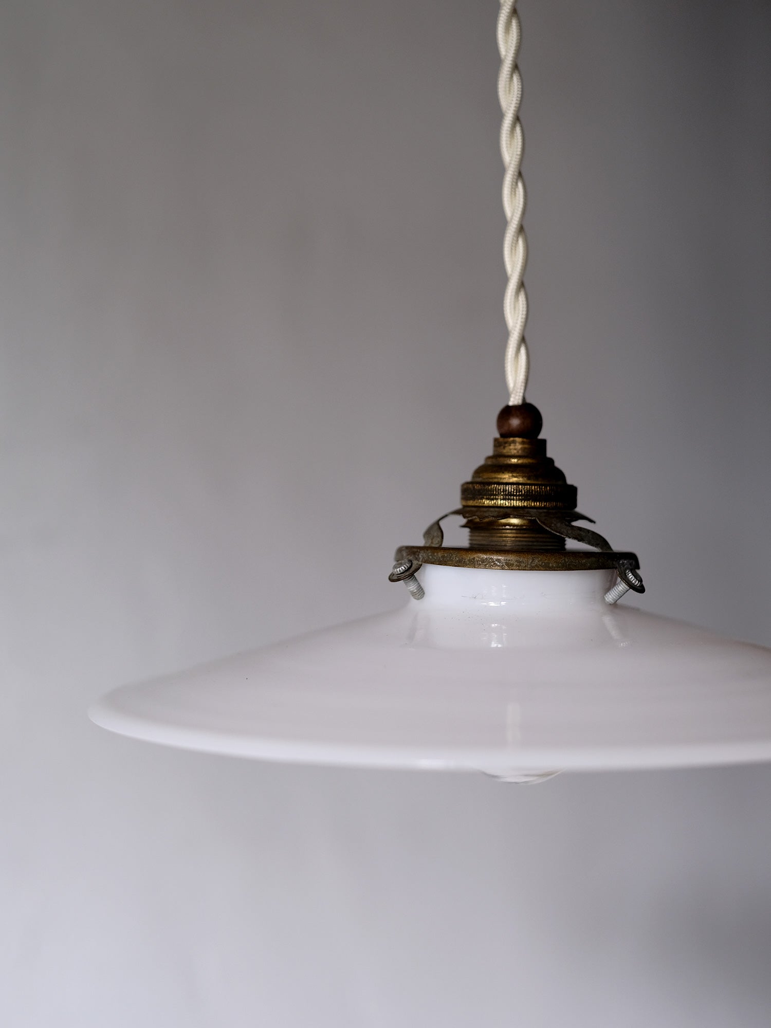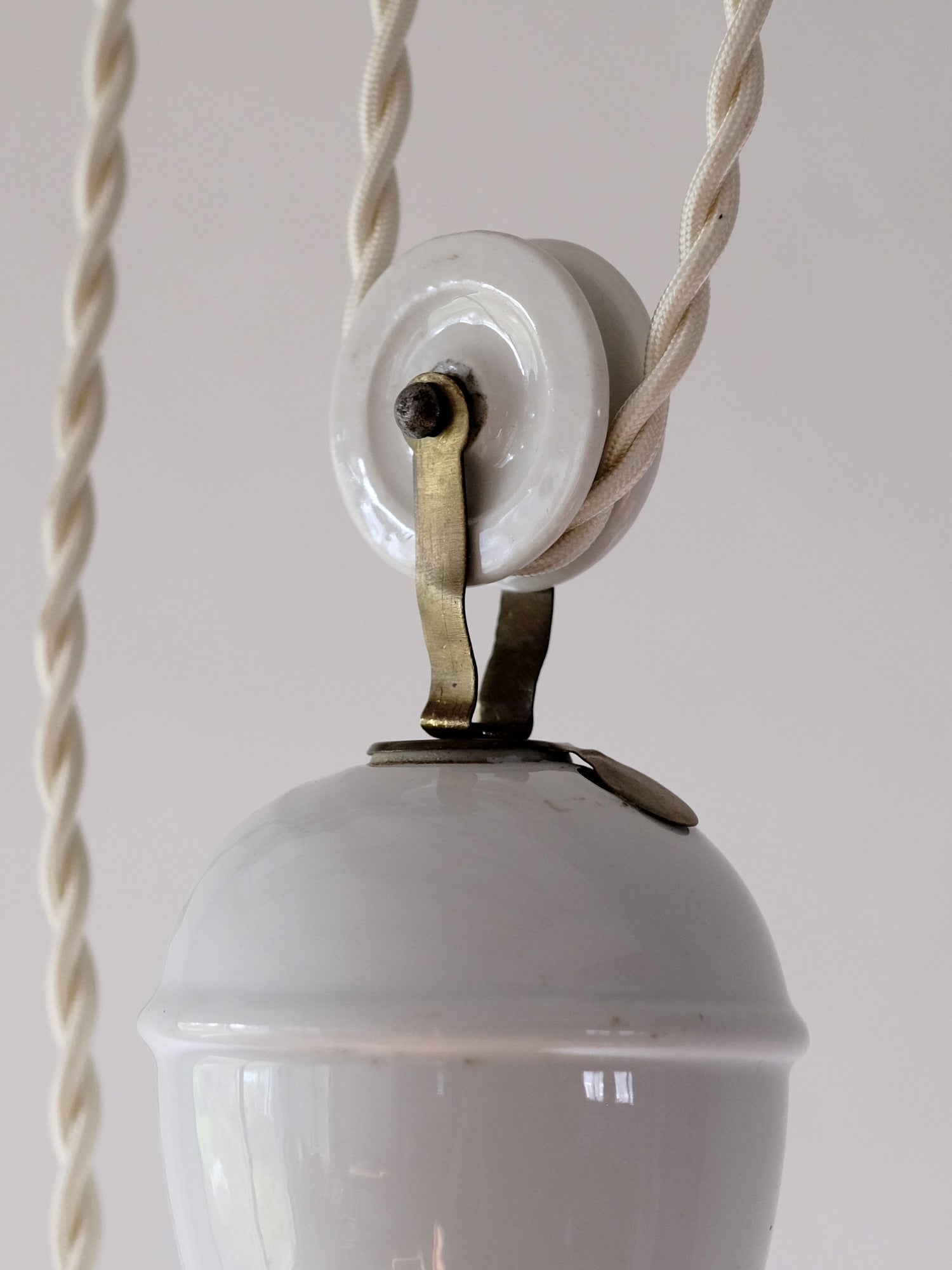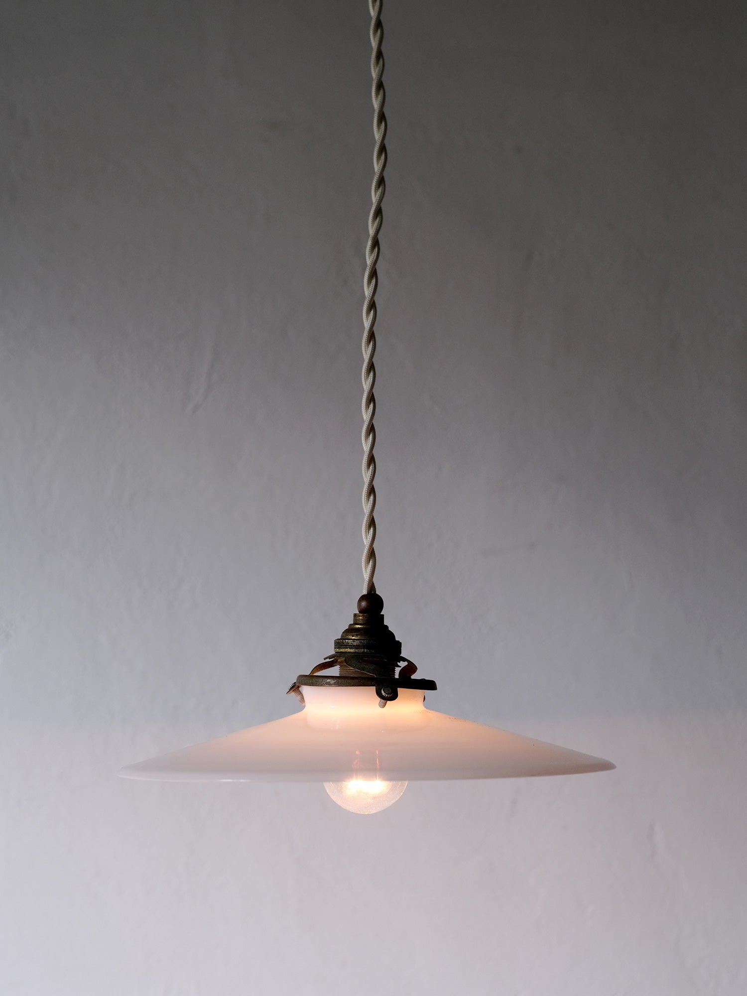 すっきりとした白磁のオモリに、渋い色合いの真鍮のソケットとギャラリー、乳白色のガラスシェードを合わせて昇降式のランプを作りました。